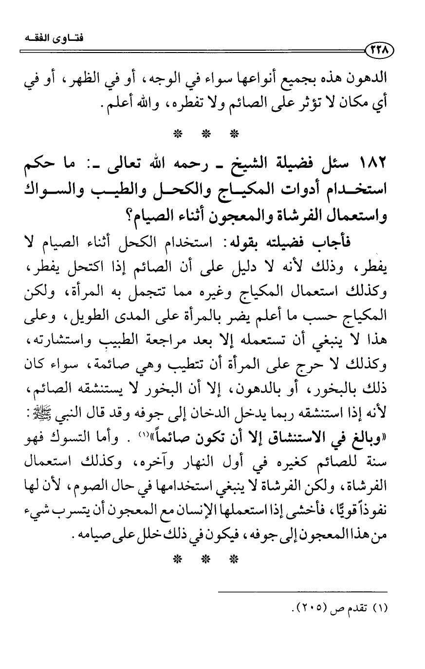 فأجاب فضيلته بقوله: استخدام الكحل أثناء الصيام لا يفطر، وذلك لأنه لا دليل على أن الصائم إذا اكتحل يفطر، وكذلك استعمال المكياج وغيره مما تتجمل به المرأة، ولكن المكياج حسب ما أعلم يضر بالمرأة على المدى الطويل، وعلى هذا لا ينبغي أن تستعمله إلا بعد مراجعة الطبيب واستشارته، وكذلك لا حرج على المرأة أن تتطيب وهي صائمة، سواء كان ذلك بالبخور، أو بالدهون، إلا أن البخور لا يستنشقه الصائم، لأنه إذا استنشقه ربما يدخل الدخان إلى جوفه وقد قال النبي صَلَّى اللَّهُ عَلَيْهِ وَسَلَّمَ: «وبالغ في الاستنشاق إلا أن تكون صائماً» . وأما التسوك فهو سنة للصائم كغيره في أول النهار وآخره، وكذلك استعمال الفرشاة، ولكن الفرشاة لا ينبغي استخدامها في حال الصوم، لأن لها نفوذاً قويًّا، فأخشى إذا استعملها الإنسان مع المعجون أن يتسرب شيء من هذا المعجون إلى جوفه، فيكون في ذلك خلل على صيامه.