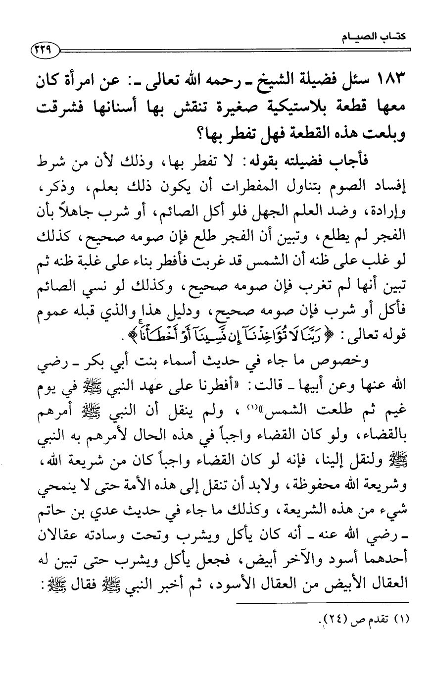 فأجاب فضيلته بقوله: لا تفطر بها، وذلك لأن من شرط إفساد الصوم بتناول المفطرات أن يكون ذلك بعلم، وذكر، وإرادة، وضد العلم الجهل فلو أكل الصائم، أو شرب جاهلاً بأن الفجر لم يطلع، وتبين أن الفجر طلع فإن صومه صحيح، كذلك لو غلب على ظنه أن الشمس قد غربت فأفطر بناء على غلبة ظنه ثم تبين أنها لم تغرب فإن صومه صحيح، وكذلك لو نسي الصائم فأكل أو شرب فإن صومه صحيح، ودليل هذا والذي قبله عموم قوله تعالى: {رَبَّنَا لاَ تُؤَاخِذْنَآ إِن نَّسِينَآ أَوْ أَخْطَأْنَا رَبَّنَا وَلاَ تَحْمِلْ عَلَيْنَآ إِصْرًا كَمَا حَمَلْتَهُ عَلَى الَّذِينَ مِن قَبْلِنَا رَبَّنَا وَلاَ تُحَمِّلْنَا مَا لاَ طَاقَةَ لَنَا بِهِ وَاعْفُ عَنَّا وَاغْفِرْ لَنَا وَارْحَمْنَآ أَنتَ مَوْلَانَا فَانْصُرْنَا عَلَى الْقَوْمِ الْكَافِرِينَ} .