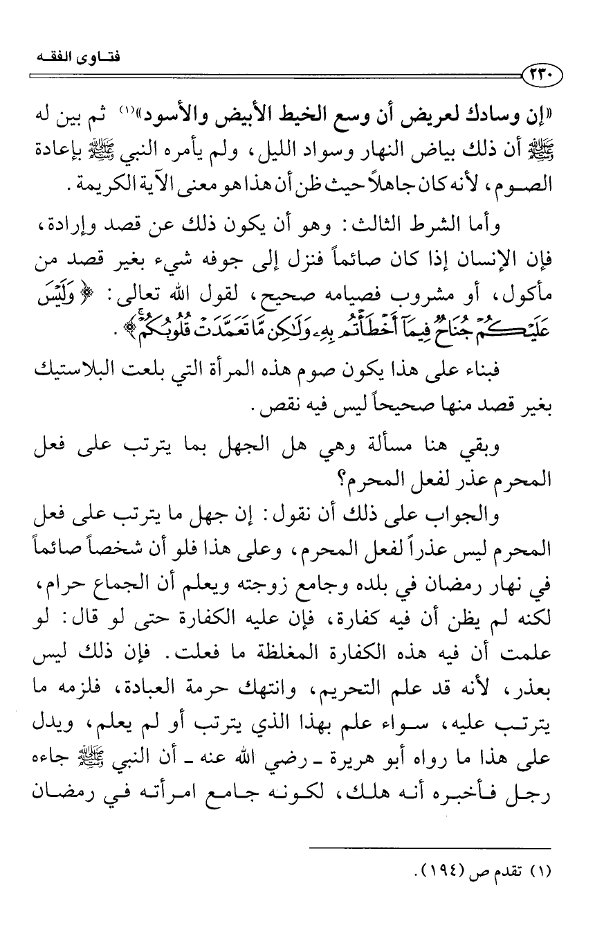 إن وسادك لعريض أن وسع الخيط الأبيض والأسود» ثم بين له صَلَّى اللَّهُ عَلَيْهِ وَسَلَّمَ أن ذلك بياض النهار وسواد الليل، ولم يأمره النبي صَلَّى اللَّهُ عَلَيْهِ وَسَلَّمَ بإعادة الصوم، لأنه كان جاهلاً حيث ظن أن هذا هو معنى الآية الكريمة.