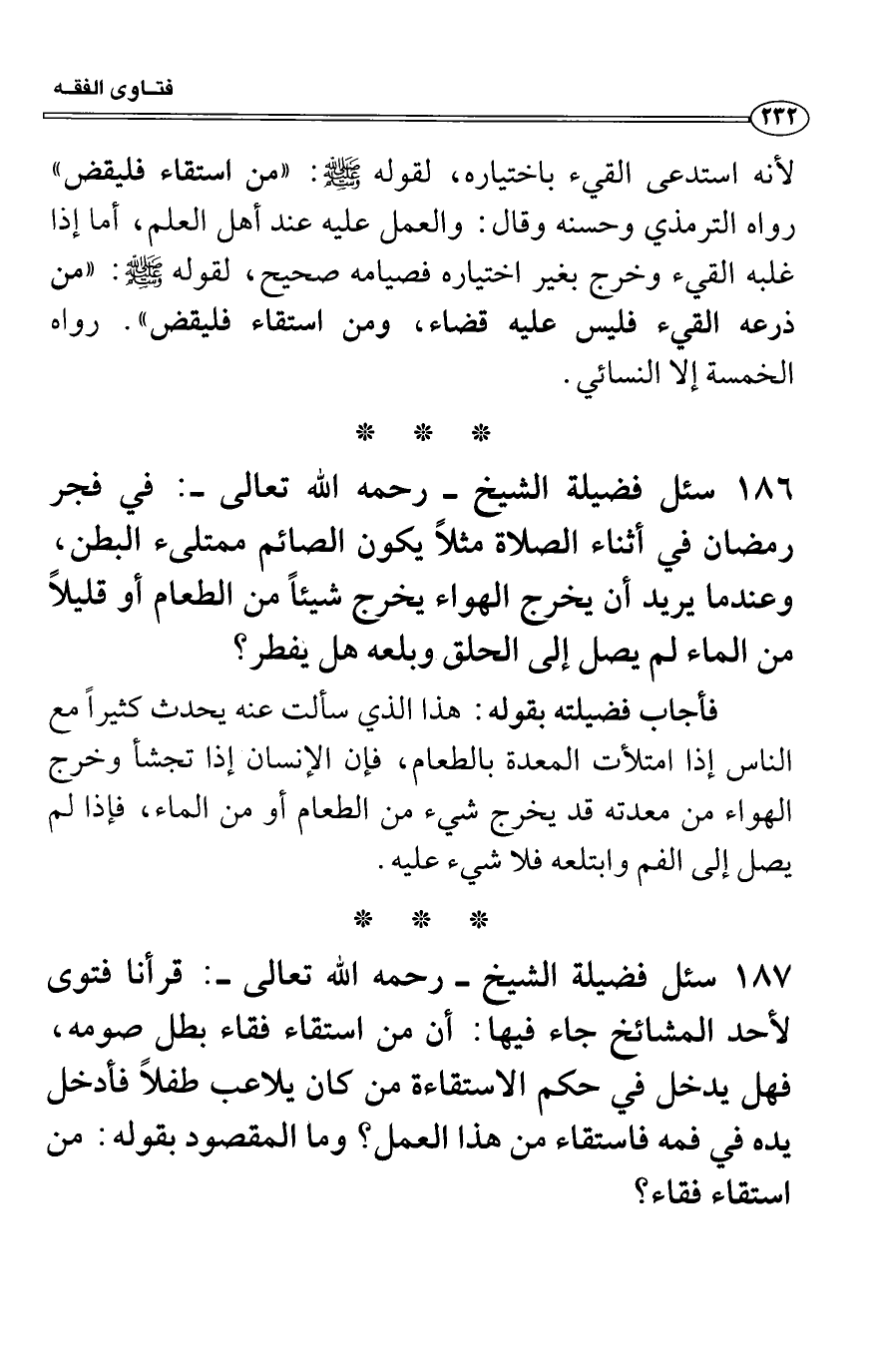 سئل فضيلة الشيخ - رحمه الله تعالى -: قرأنا فتوى لأحد المشائخ جاء فيها: أن من استقاء فقاء بطل صومه، فهل يدخل في حكم الاستقاءة من كان يلاعب طفلاً فأدخل يده في فمه فاستقاء من هذا العمل؟ وما المقصود بقوله: من استقاء فقاء؟