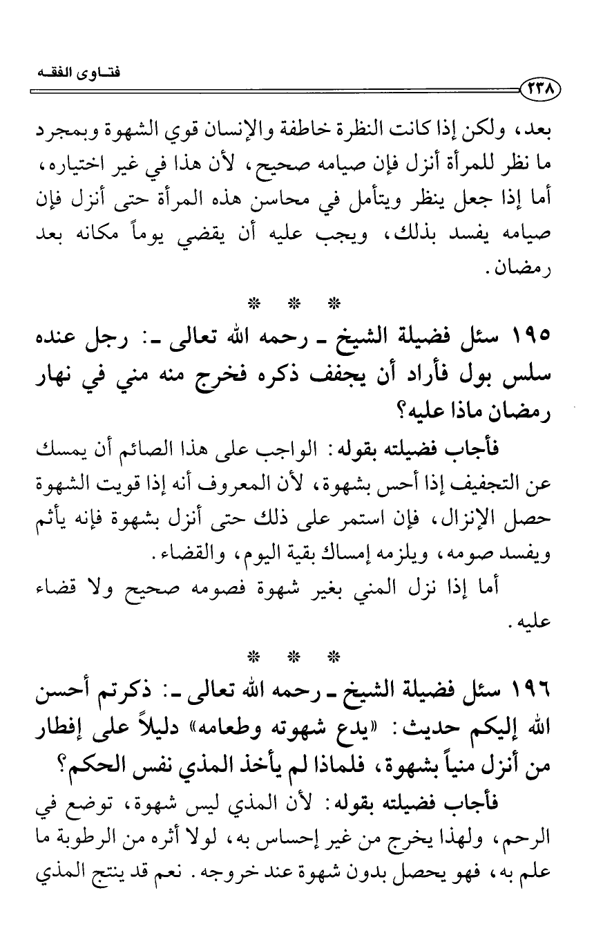 سئل فضيلة الشيخ - رحمه الله تعالى -: ذكرتم أحسن الله إليكم حديث: «يدع شهوته وطعامه» دليلاً على إفطار من أنزل منياً بشهوة، فلماذا لم يأخذ المذي نفس الحكم؟