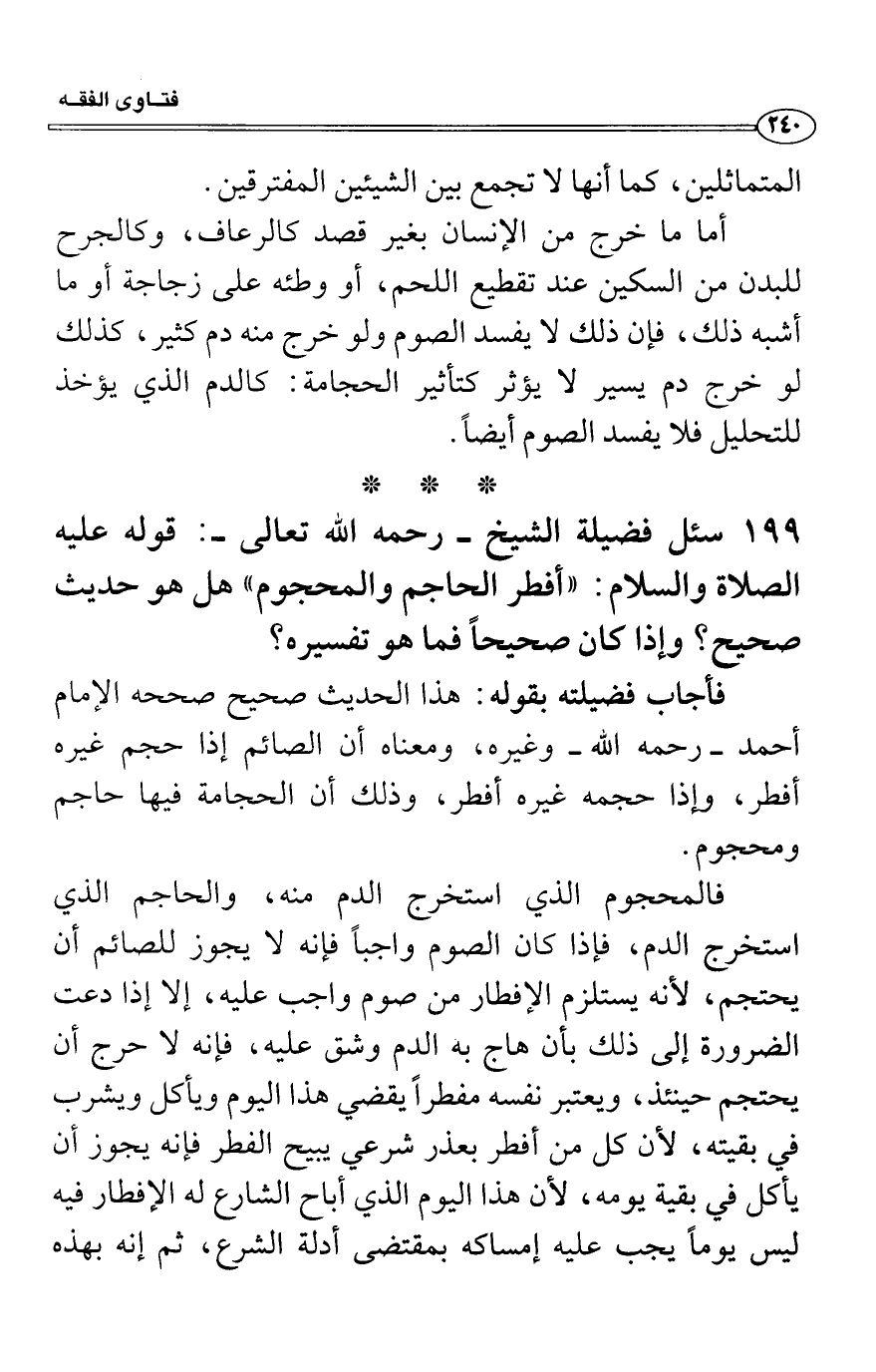 فأجاب فضيلته بقوله: هذا الحديث صحيح صححه الإمام أحمد رحمه الله وغيره، ومعناه أن الصائم إذا حجم غيره أفطر، وإذا حجمه غيره أفطر، وذلك أن الحجامة فيها حاجم ومحجوم.