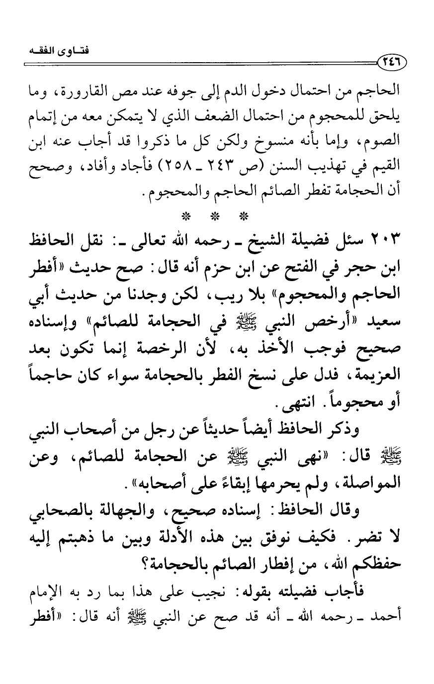 سئل فضيلة الشيخ - رحمه الله تعالى -: نقل الحافظ ابن حجر في الفتح عن ابن حزم أنه قال: صح حديث «أفطر الحاجم والمحجوم» بلا ريب، لكن وجدنا من حديث أبي سعيد «أرخص النبي صَلَّى اللَّهُ عَلَيْهِ وَسَلَّمَ في الحجامة للصائم» وإسناده صحيح فوجب الأخذ به، لأن الرخصة إنما تكون بعد العزيمة، فدل على نسخ الفطر بالحجامة سواء كان حاجماً أو محجوماً. انتهى.