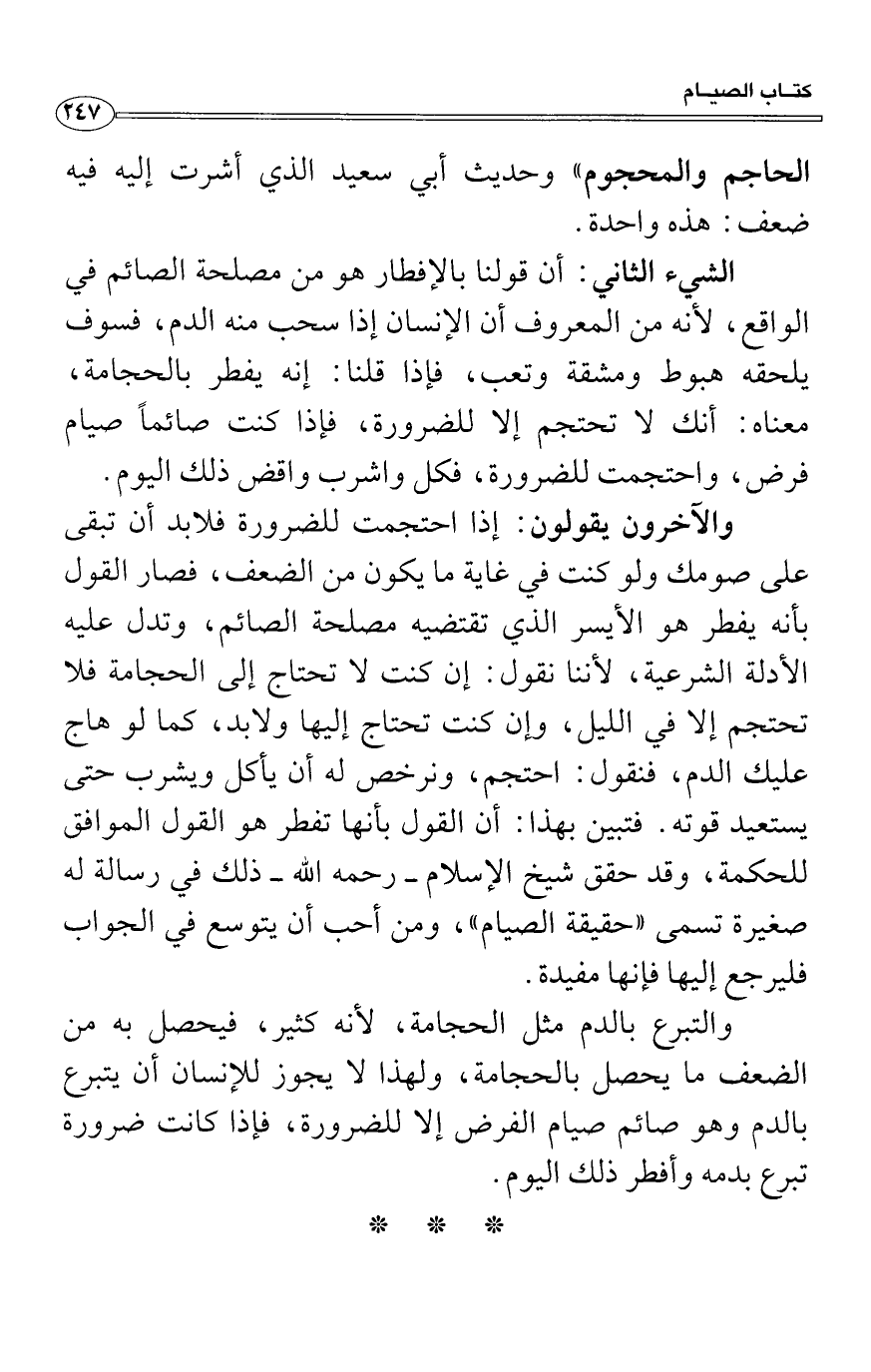 والآخرون يقولون: إذا احتجمت للضرورة فلابد أن تبقى على صومك ولو كنت في غاية ما يكون من الضعف، فصار القول بأنه يفطر هو الأيسر الذي تقتضيه مصلحة الصائم، وتدل عليه الأدلة الشرعية، لأننا نقول: إن كنت لا تحتاج إلى الحجامة فلا تحتجم إلا في الليل، وإن كنت تحتاج إليها ولابد، كما لو هاج عليك الدم، فنقول: احتجم، ونرخص له أن يأكل ويشرب حتى يستعيد قوته. فتبين بهذا: أن القول بأنها تفطر هو القول الموافق للحكمة، وقد حقق شيخ الإسلام رحمه الله ذلك في رسالة له صغيرة تسمى «حقيقة الصيام» ، ومن أحب أن يتوسع في الجواب فليرجع إليها فإنها مفيدة.