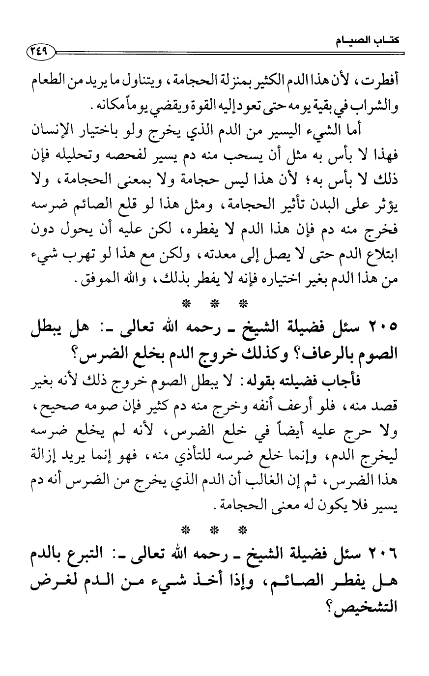 602 سئل فضيلة الشيخ - رحمه الله تعالى -: التبرع بالدم هل يفطر الصائم، وإذا أخذ شيء من الدم لغرض التشخيص؟
