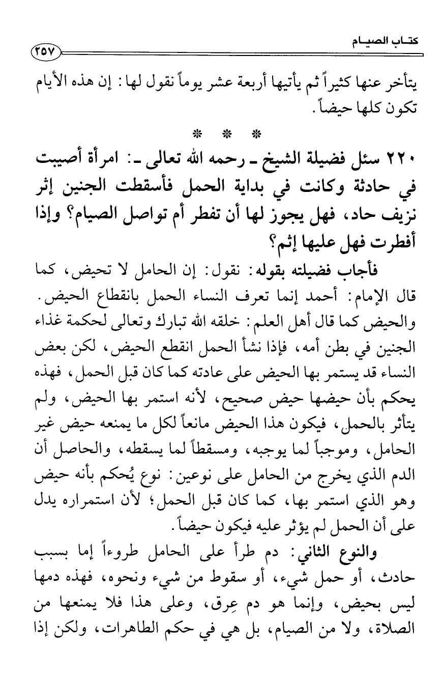 فأجاب فضيلته بقوله: نقول: إن الحامل لا تحيض، كما قال الإمام: أحمد إنما تعرف النساء الحمل بانقطاع الحيض. والحيض كما قال أهل العلم: خلقه الله تبارك وتعالى لحكمة غذاء الجنين في بطن أمه، فإذا نشأ الحمل انقطع الحيض، لكن بعض النساء قد يستمر بها الحيض على عادته كما كان قبل الحمل، فهذه يحكم بأن حيضها حيض صحيح، لأنه استمر بها الحيض، ولم يتأثر بالحمل، فيكون هذا الحيض مانعاً لكل ما يمنعه حيض غير الحامل، وموجباً لما يوجبه، ومسقطاً لما يسقطه، والحاصل أن الدم الذي يخرج من الحامل على نوعين: نوع يُحكم بأنه حيض وهو الذي استمر بها، كما كان قبل الحمل؛ لأن استمراره يدل على أن الحمل لم يؤثر عليه فيكون حيضاً.