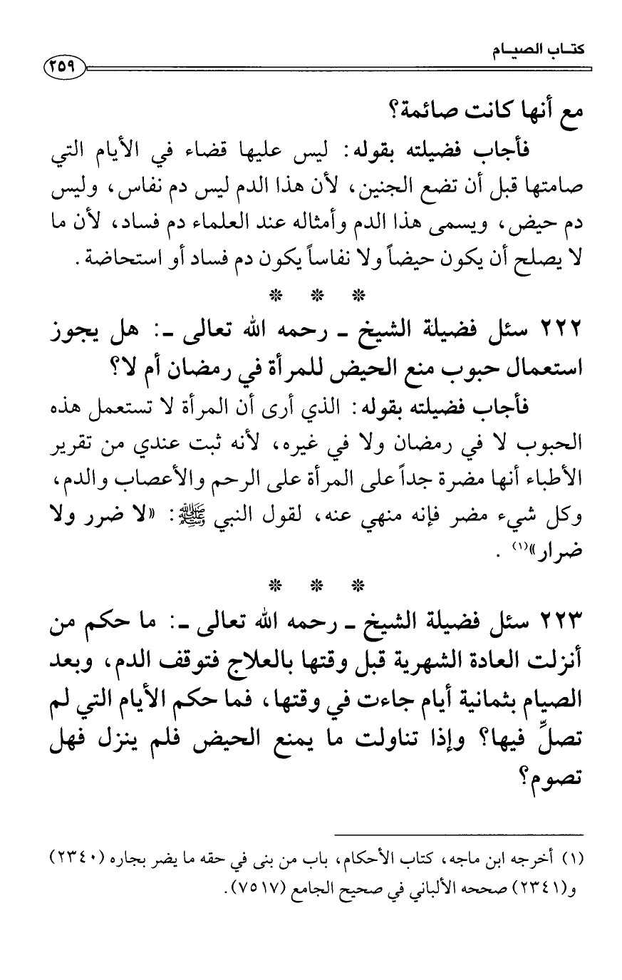 فأجاب فضيلته بقوله: الذي أرى أن المرأة لا تستعمل هذه الحبوب لا في رمضان ولا في غيره، لأنه ثبت عندي من تقرير الأطباء أنها مضرة جداً على المرأة على الرحم والأعصاب والدم، وكل شيء مضر فإنه منهي عنه، لقول النبي صَلَّى اللَّهُ عَلَيْهِ وَسَلَّمَ: «لا ضرر ولا ضرار» .