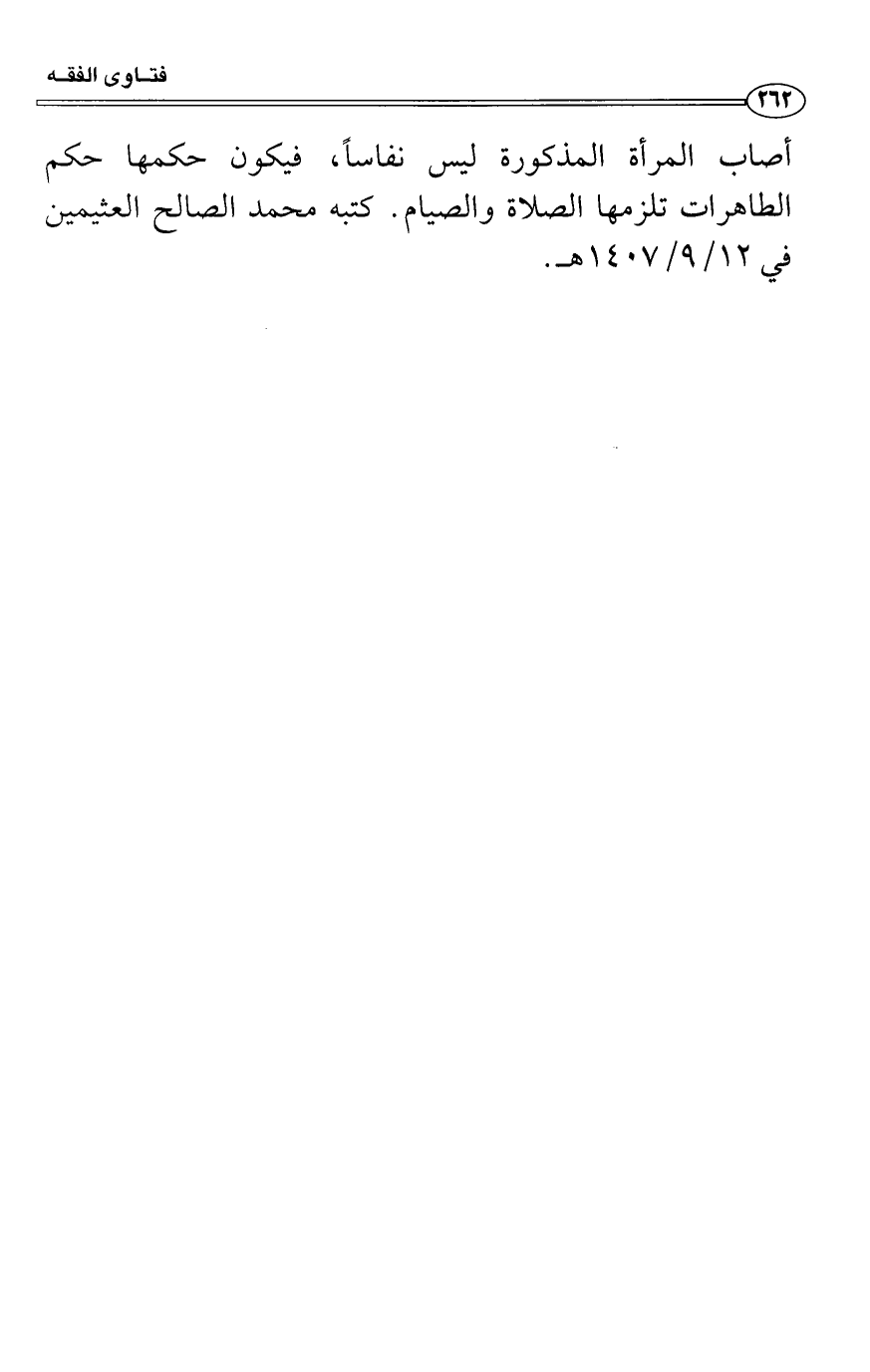 أصاب المرأة المذكورة ليس نفاساً، فيكون حكمها حكم الطاهرات تلزمها الصلاة والصيام. كتبه محمد الصالح العثيمين في 12/9/1407 هـ.