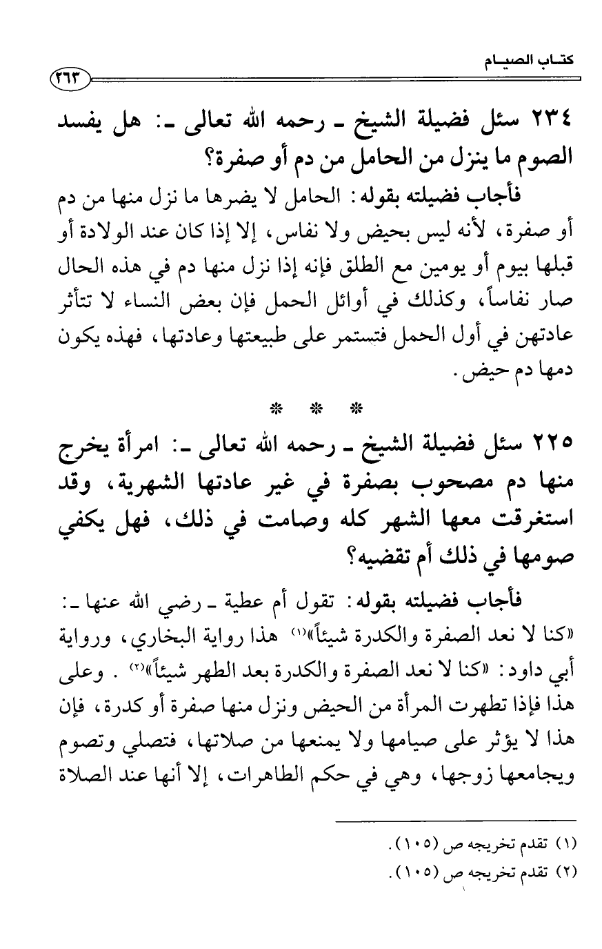 فأجاب فضيلته بقوله: تقول أم عطية رضي الله عنها: «كنا لا نعد الصفرة والكدرة شيئاً» هذا رواية البخاري، ورواية أبي داود: «كنا لا نعد الصفرة والكدرة بعد الطهر شيئاً» . وعلى هذا فإذا تطهرت المرأة من الحيض ونزل منها صفرة أو كدرة، فإن هذا لا يؤثر على صيامها ولا يمنعها من صلاتها، فتصلي وتصوم ويجامعها زوجها، وهي في حكم الطاهرات، إلا أنها عند الصلاة