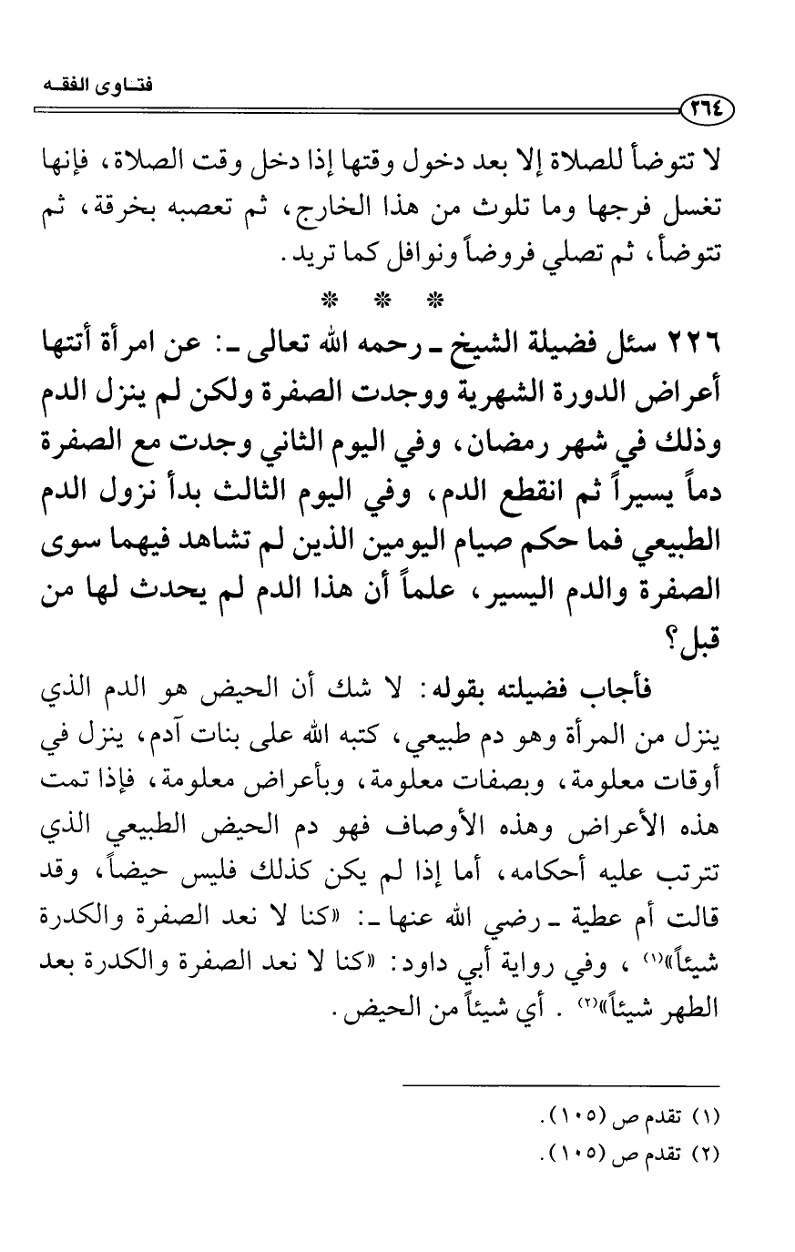 فأجاب فضيلته بقوله: لا شك أن الحيض هو الدم الذي ينزل من المرأة وهو دم طبيعي، كتبه الله على بنات آدم، ينزل في أوقات معلومة، وبصفات معلومة، وبأعراض معلومة، فإذا تمت هذه الأعراض وهذه الأوصاف فهو دم الحيض الطبيعي الذي تترتب عليه أحكامه، أما إذا لم يكن كذلك فليس حيضاً، وقد قالت أم عطية رضي الله عنها: «كنا لا نعد الصفرة والكدرة شيئاً» ، وفي رواية أبي داود: «كنا لا نعد الصفرة والكدرة بعد الطهر شيئاً» . أي شيئاً من الحيض.