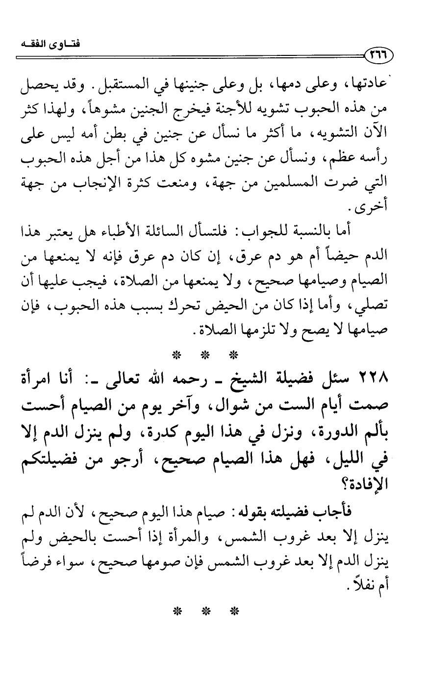 عادتها، وعلى دمها، بل وعلى جنينها في المستقبل. وقد يحصل من هذه الحبوب تشويه للأجنة فيخرج الجنين مشوهاً، ولهذا كثر الآن التشويه، ما أكثر ما نسأل عن جنين في بطن أمه ليس على رأسه عظم، ونسأل عن جنين مشوه كل هذا من أجل هذه الحبوب التي ضرت المسلمين من جهة، ومنعت كثرة الإنجاب من جهة أخرى.