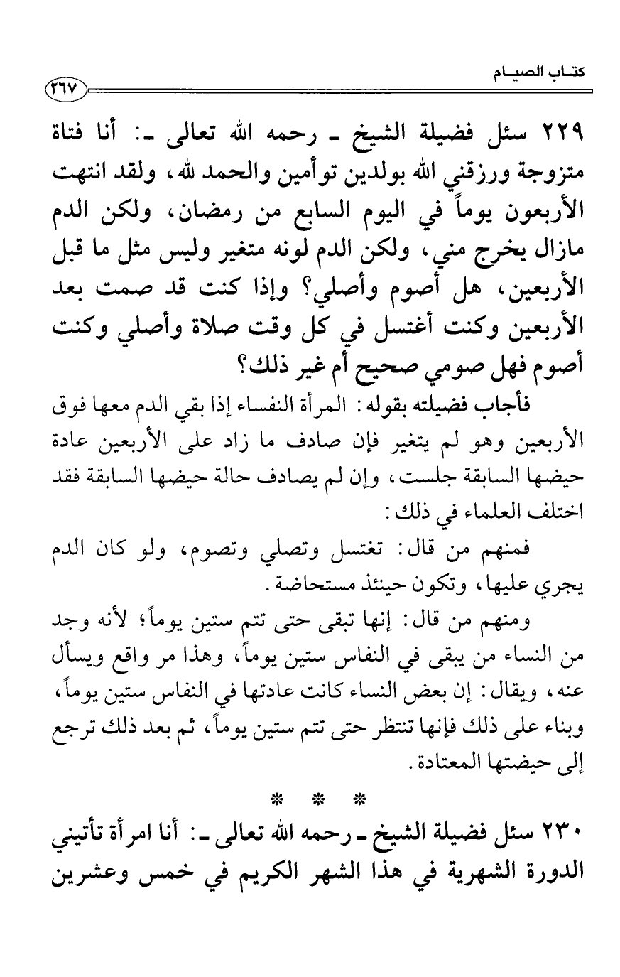سئل فضيلة الشيخ - رحمه الله تعالى -: أنا فتاة متزوجة ورزقني الله بولدين توأمين والحمد لله، ولقد انتهت الأربعون يوماً في اليوم السابع من رمضان، ولكن الدم مازال يخرج مني، ولكن الدم لونه متغير وليس مثل ما قبل الأربعين، هل أصوم وأصلي؟ وإذا كنت قد صمت بعد الأربعين وكنت أغتسل في كل وقت صلاة وأصلي وكنت أصوم فهل صومي صحيح أم غير ذلك؟