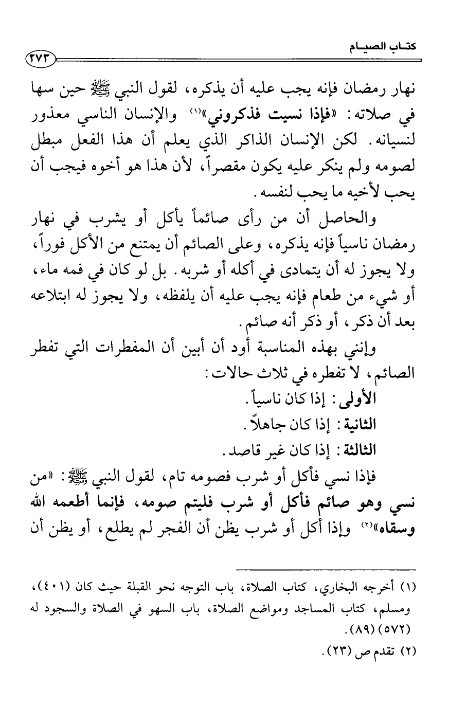 فإذا نسي فأكل أو شرب فصومه تام، لقول النبي صَلَّى اللَّهُ عَلَيْهِ وَسَلَّمَ: «من نسي وهو صائم فأكل أو شرب فليتم صومه، فإنما أطعمه الله وسقاه» وإذا أكل أو شرب يظن أن الفجر لم يطلع، أو يظن أن