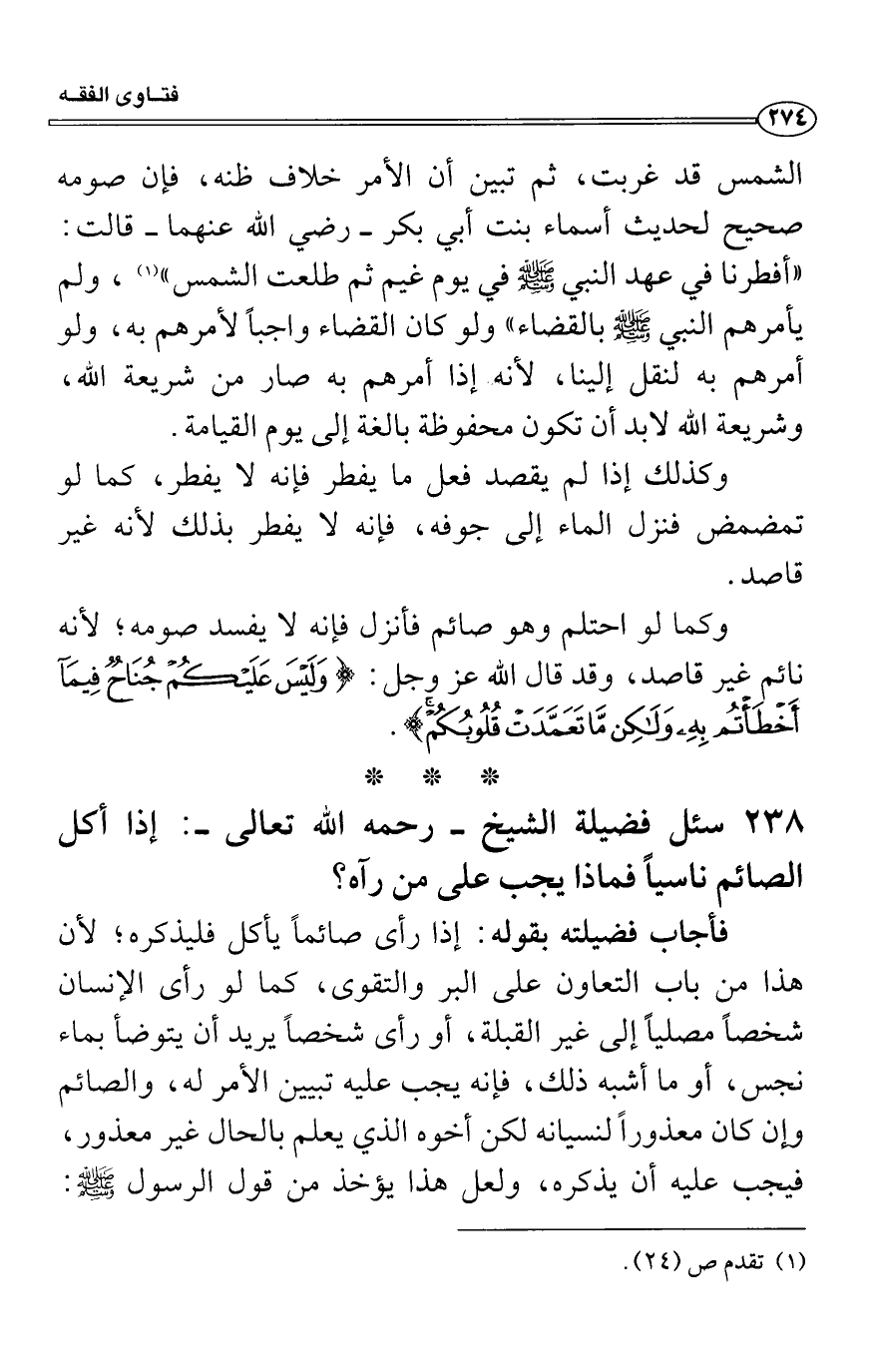 الشمس قد غربت، ثم تبين أن الأمر خلاف ظنه، فإن صومه صحيح لحديث أسماء بنت أبي بكر رضي الله عنهما قالت: «أفطرنا في عهد النبي صَلَّى اللَّهُ عَلَيْهِ وَسَلَّمَ في يوم غيم ثم طلعت الشمس» ، ولم يأمرهم النبي صَلَّى اللَّهُ عَلَيْهِ وَسَلَّمَ بالقضاء» ولو كان القضاء واجباً لأمرهم به، ولو أمرهم به لنقل إلينا، لأنه إذا أمرهم به صار من شريعة الله، وشريعة الله لابد أن تكون محفوظة بالغة إلى يوم القيامة.