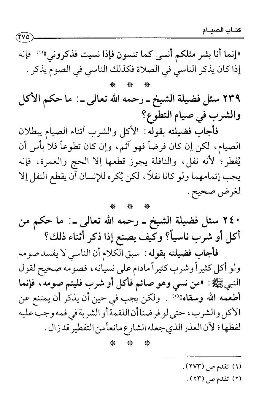 فأجاب فضيلته بقوله: سبق الكلام أن الناسي لا يفسد صومه ولو أكل كثيراً وشرب كثيراً مادام على نسيانه، فصومه صحيح لقول النبي صَلَّى اللَّهُ عَلَيْهِ وَسَلَّمَ: «من نسي وهو صائم فأكل أو شرب فليتم صومه، فإنما أطعمه الله وسقاه» . ولكن يجب في حين أن يذكر أن يمتنع عن الأكل والشرب، حتى لو فرضنا أن اللقمة أو الشربة في فمه وجب عليه لفظها؛ لأن العذر الذي جعله الشارع مانعاً من التفطير قد زال.