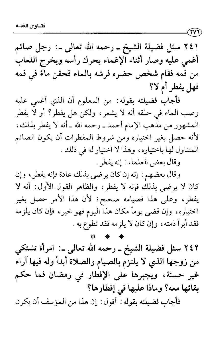 سئل فضيلة الشيخ - رحمه الله تعالى -: رجل صائم أغمي عليه وصار أثناء الإغماء يحرك رأسه ويخرج اللعاب من فمه فقام شخص حضره فرشه بالماء فحقن ماءً في فمه فهل يفطر أم لا؟