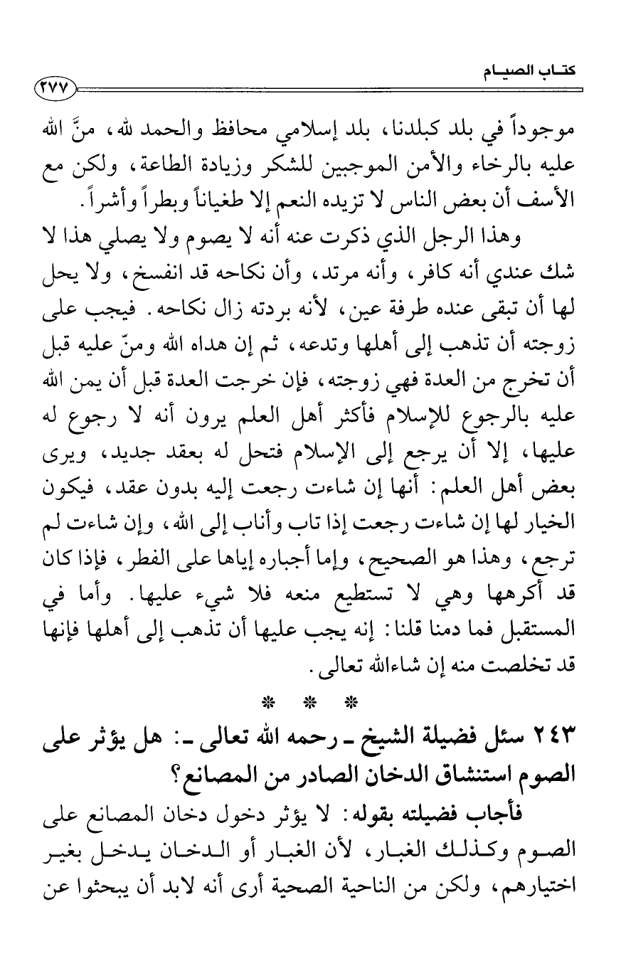 سئل فضيلة الشيخ - رحمه الله تعالى -: هل يؤثر على الصوم استنشاق الدخان الصادر من المصانع؟