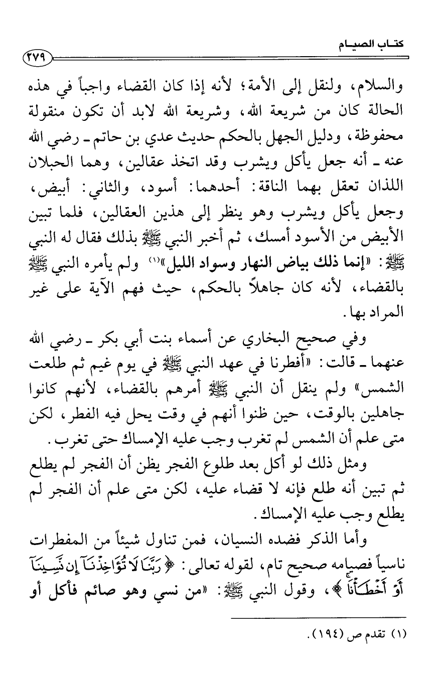 والسلام، ولنقل إلى الأمة؛ لأنه إذا كان القضاء واجباً في هذه الحالة كان من شريعة الله، وشريعة الله لابد أن تكون منقولة محفوظة، ودليل الجهل بالحكم حديث عدي بن حاتم رضي الله عنه أنه جعل يأكل ويشرب وقد اتخذ عقالين، وهما الحبلان اللذان تعقل بهما الناقة: أحدهما: أسود، والثاني: أبيض، وجعل يأكل ويشرب وهو ينظر إلى هذين العقالين، فلما تبين الأبيض من الأسود أمسك، ثم أخبر النبي صَلَّى اللَّهُ عَلَيْهِ وَسَلَّمَ بذلك فقال له النبي صَلَّى اللَّهُ عَلَيْهِ وَسَلَّمَ: «إنما ذلك بياض النهار وسواد الليل» ولم يأمره النبي صَلَّى اللَّهُ عَلَيْهِ وَسَلَّمَ بالقضاء، لأنه كان جاهلاً بالحكم، حيث فهم الآية على غير المراد بها.