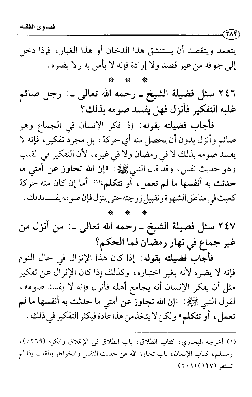 فأجاب فضيلته بقوله: إذا فكر الإنسان في الجماع وهو صائم وأنزل بدون أن يحصل منه أي حركة، بل مجرد تفكير، فإنه لا يفسد صومه بذلك لا في رمضان ولا في غيره، لأن التفكير في القلب وهو حديث نفس، وقد قال النبي صَلَّى اللَّهُ عَلَيْهِ وَسَلَّمَ: «إن الله تجاوز عن أمتي ما حدثت به أنفسها ما لم تعمل، أو تتكلم» أما إن كان منه حركة كعبث في مناطق الشهوة وتقبيل زوجته حتى ينزل فإن صومه يفسد بذلك.