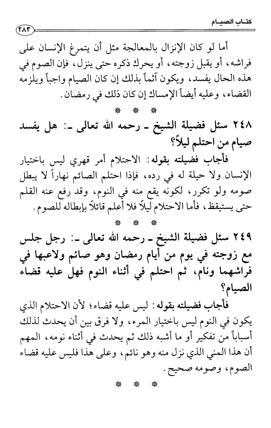 سئل فضيلة الشيخ - رحمه الله تعالى -: رجل جلس مع زوجته في يوم من أيام رمضان وهو صائم ولاعبها في فراشهما ونام، ثم احتلم في أثناء النوم فهل عليه قضاء الصيام؟