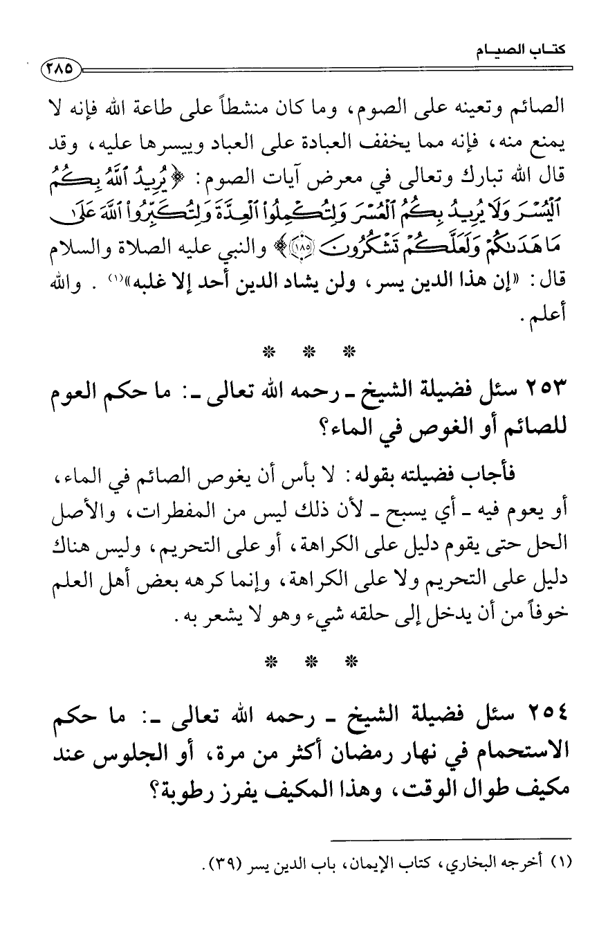 فأجاب فضيلته بقوله: لا بأس أن يغوص الصائم في الماء، أو يعوم فيه أي يسبح لأن ذلك ليس من المفطرات، والأصل الحل حتى يقوم دليل على الكراهة، أو على التحريم، وليس هناك دليل على التحريم ولا على الكراهة، وإنما كرهه بعض أهل العلم خوفاً من أن يدخل إلى حلقه شيء وهو لا يشعر به.