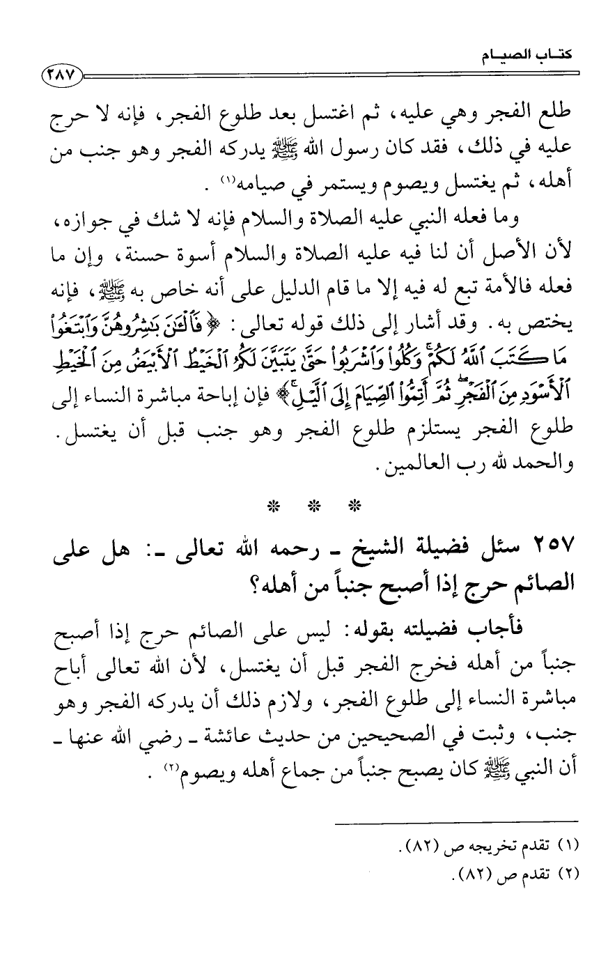 فأجاب فضيلته بقوله: ليس على الصائم حرج إذا أصبح جنباً من أهله فخرج الفجر قبل أن يغتسل، لأن الله تعالى أباح مباشرة النساء إلى طلوع الفجر، ولازم ذلك أن يدركه الفجر وهو جنب، وثبت في الصحيحين من حديث عائشة رضي الله عنها أن النبي صَلَّى اللَّهُ عَلَيْهِ وَسَلَّمَ كان يصبح جنباً من جماع أهله ويصوم.
