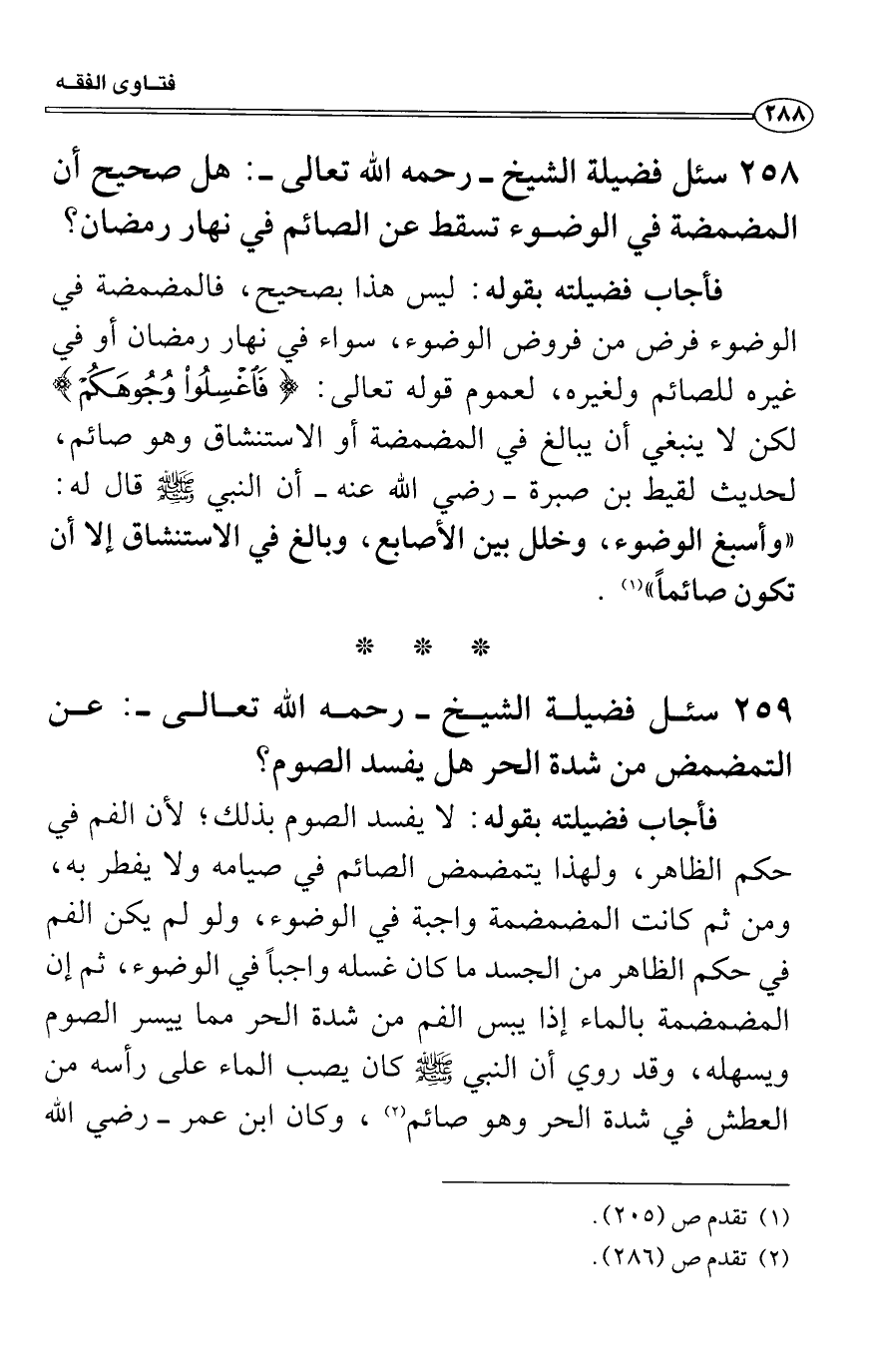 852 سئل فضيلة الشيخ - رحمه الله تعالى -: هل صحيح أن المضمضة في الوضوء تسقط عن الصائم في نهار رمضان؟