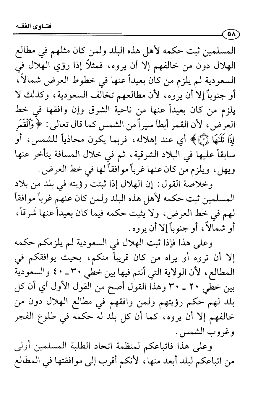 وعلى هذا فإذا ثبت الهلال في السعودية لم يلزمكم حكمه إلا أن تروه أو يراه من كان قريباً منكم، بحيث يوافقكم في المطالع، لأن الولاية التي أنتم فيها بين خطي 03 04 والسعودية بين خطي 02 03 وهذا القول أصح من القول الأول أي أن كل بلد لهم حكم رؤيتهم ولمن وافقهم في مطالع الهلال دون من خالفهم إلا أن يروه، كما أن كل بلد له حكمه في طلوع الفجر وغروب الشمس.
