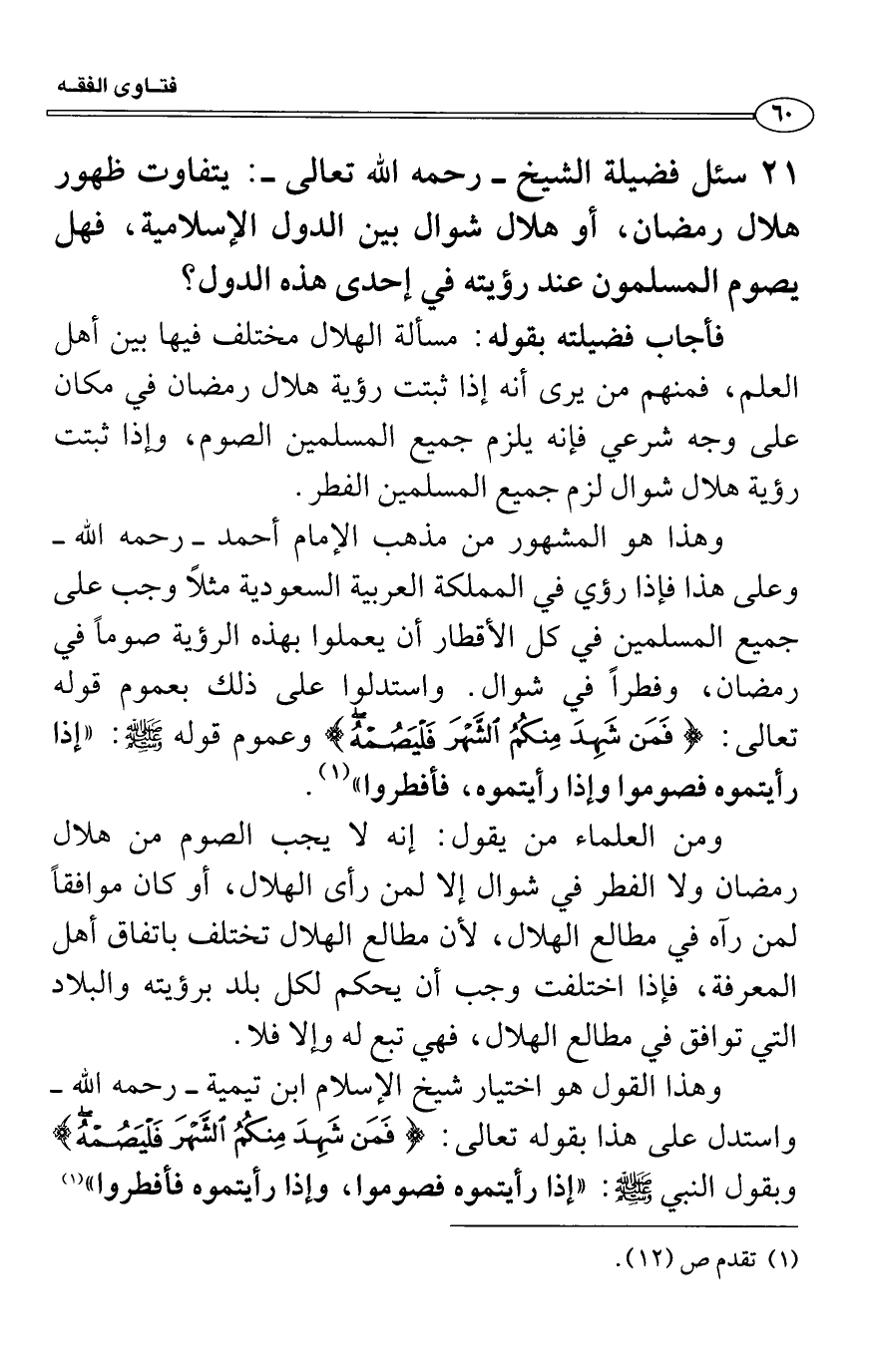 12 سئل فضيلة الشيخ - رحمه الله تعالى -: يتفاوت ظهور هلال رمضان، أو هلال شوال بين الدول الإسلامية، فهل يصوم المسلمون عند رؤيته في إحدى هذه الدول؟