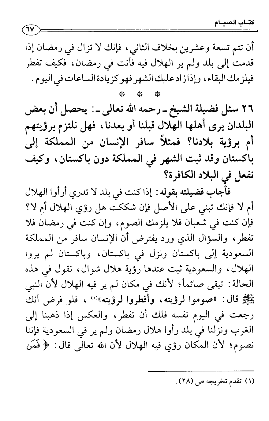 فأجاب فضيلته بقوله: إذا كنت في بلد لا تدري أرأوا الهلال أم لا فإنك تبني على الأصل فإن شككت هل رؤي الهلال أم لا؟ فإن كنت في شعبان فلا يلزمك الصوم، وإن كنت في رمضان فلا تفطر، والسؤال الذي ورد يفترض أن الإنسان سافر من المملكة السعودية إلى باكستان ونزل في باكستان، وباكستان لم يروا الهلال، والسعودية ثبت عندها رؤية هلال شوال، نقول في هذه الحالة: تبقى صائماً؛ لأنك في مكان لم ير فيه الهلال لأن النبي صَلَّى اللَّهُ عَلَيْهِ وَسَلَّمَ قال: «صوموا لرؤيته، وأفطروا لرؤيته» ، فلو فرض أنك رجعت في اليوم نفسه فلك أن تفطر، والعكس إذا ذهبنا إلى الغرب ونزلنا في بلد رأوا هلال رمضان ولم ير في السعودية فإننا نصوم؛ لأن المكان رؤي فيه الهلال لأن الله تعالى قال: {فَمَن