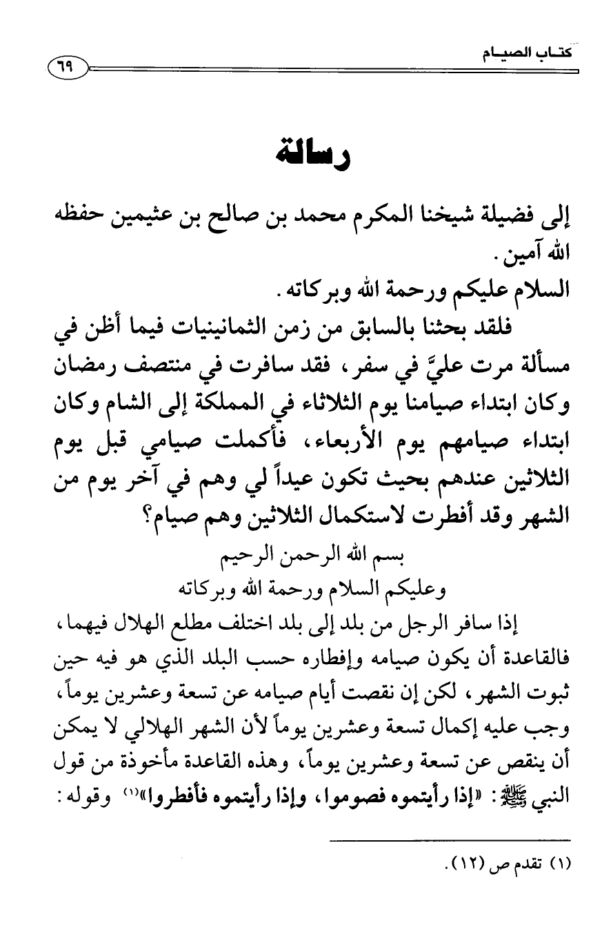 إذا سافر الرجل من بلد إلى بلد اختلف مطلع الهلال فيهما، فالقاعدة أن يكون صيامه وإفطاره حسب البلد الذي هو فيه حين ثبوت الشهر، لكن إن نقصت أيام صيامه عن تسعة وعشرين يوماً، وجب عليه إكمال تسعة وعشرين يوماً لأن الشهر الهلالي لا يمكن أن ينقص عن تسعة وعشرين يوماً، وهذه القاعدة مأخوذة من قول النبي صَلَّى اللَّهُ عَلَيْهِ وَسَلَّمَ: «إذا رأيتموه فصوموا، وإذا رأيتموه فأفطروا»