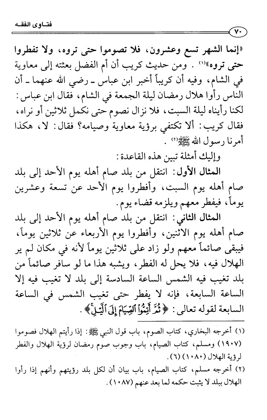 المثال الثاني: انتقل من بلد صام أهله يوم الأحد إلى بلد صام أهله يوم الاثنين، وأفطروا يوم الأربعاء عن ثلاثين يوماً، فيبقى صائماً معهم ولو زاد على ثلاثين يوماً لأنه في مكان لم ير الهلال فيه، فلا يحل له الفطر، ويشبه هذا ما لو سافر صائماً من بلد تغيب فيه الشمس الساعة السادسة إلى بلد لا تغيب فيه إلا الساعة السابعة، فإنه لا يفطر حتى تغيب الشمس في الساعة السابعة لقوله تعالى: {ثُمَّ أَتِمُّواْ الصِّيَامَ إِلَى الَّيْلِ