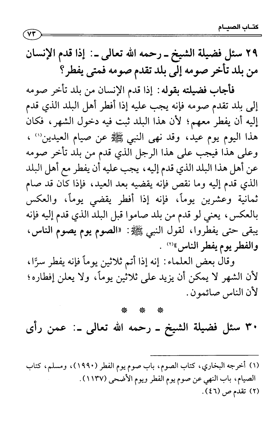 فأجاب فضيلته بقوله: إذا قدم الإنسان من بلد تأخر صومه إلى بلد تقدم صومه فإنه يجب عليه إذا أفطر أهل البلد الذي قدم إليه أن يفطر معهم؛ لأن هذا البلد ثبت فيه دخول الشهر، فكان هذا اليوم يوم عيد، وقد نهى النبي صَلَّى اللَّهُ عَلَيْهِ وَسَلَّمَ عن صيام العيدين، وعلى هذا فيجب على هذا الرجل الذي قدم من بلد تأخر صومه عن أهل هذا البلد الذي قدم إليه، يجب عليه أن يفطر مع أهل البلد الذي قدم إليه وما نقص فإنه يقضيه بعد العيد، فإذا كان قد صام ثمانية وعشرين يوماً، فإنه إذا أفطر يقضي يوماً، والعكس بالعكس، يعني لو قدم من بلد صاموا قبل البلد الذي قدم إليه فإنه يبقى حتى يفطروا، لقول النبي صَلَّى اللَّهُ عَلَيْهِ وَسَلَّمَ: «الصوم يوم يصوم الناس، والفطر يوم يفطر الناس» .