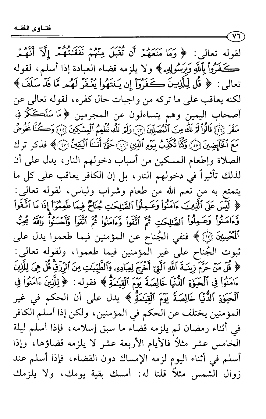 لِلَّذِينَءَامَنُواْ فِى الْحياةِ الدُّنْيَا خَالِصَةً يَوْمَ الْقِيَامَةِ كَذَلِكَ نُفَصِّلُ الآيَاتِ لِقَوْمٍ يَعْلَمُونَ} فقوله: {لِلَّذِينَءَامَنُواْ فِى الْحياةِ الدُّنْيَا خَالِصَةً يَوْمَ الْقِيَامَةِ كَذَلِكَ نُفَصِّلُ الآيَاتِ لِقَوْمٍ يَعْلَمُونَ} يدل على أن الحكم في غير المؤمنين يختلف عن الحكم في المؤمنين، ولكن إذا أسلم الكافر في أثناء رمضان لم يلزمه قضاء ما سبق إسلامه، فإذا أسلم ليلة الخامس عشر مثلاً فالأيام الأربعة عشر لا يلزمه قضاؤها، وإذا أسلم في أثناء اليوم لزمه الإمساك دون القضاء، فإذا أسلم عند زوال الشمس مثلاً قلنا له: أمسك بقية يومك، ولا يلزمك