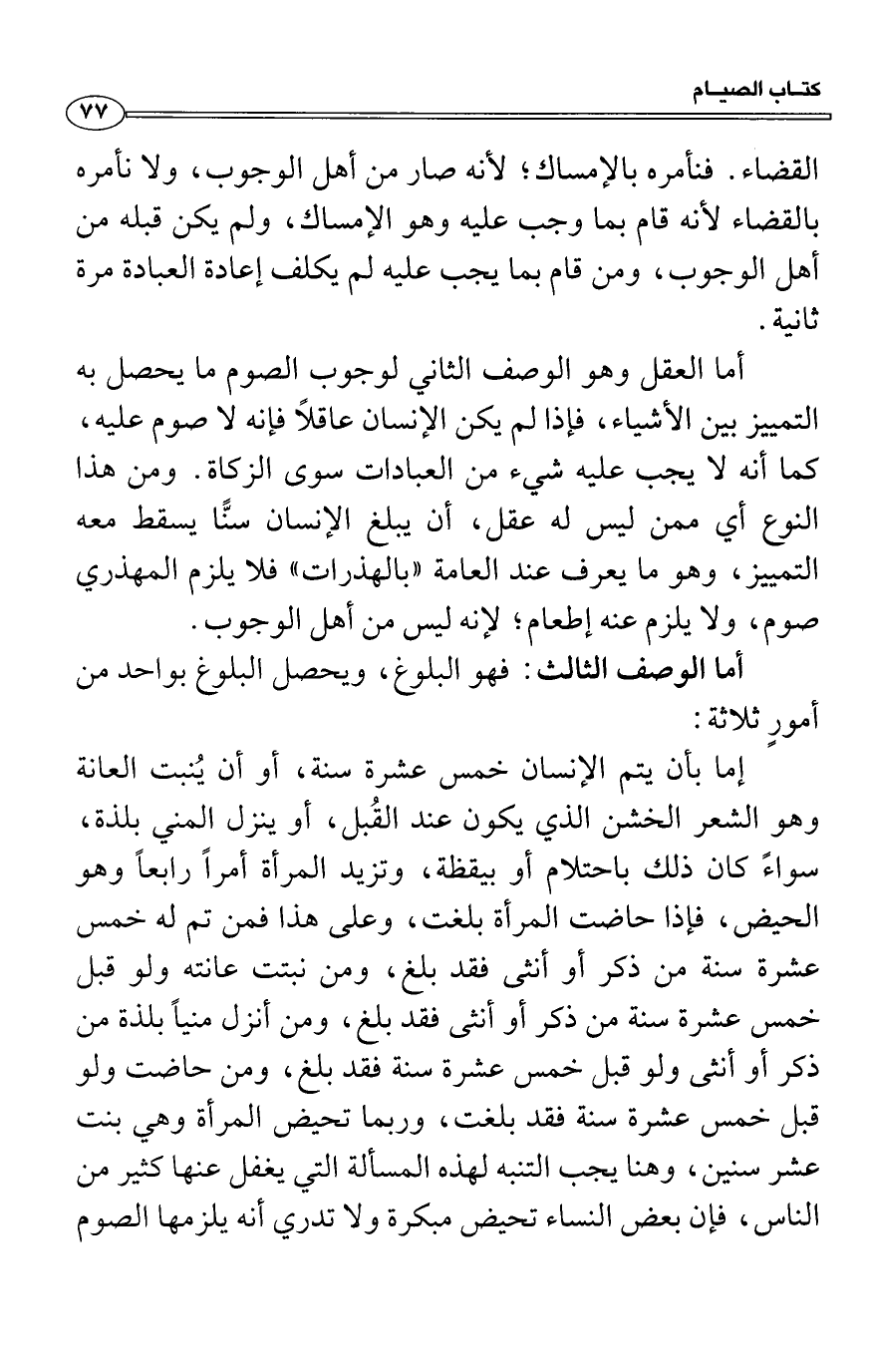 أما العقل وهو الوصف الثاني لوجوب الصوم ما يحصل به التمييز بين الأشياء، فإذا لم يكن الإنسان عاقلاً فإنه لا صوم عليه، كما أنه لا يجب عليه شيء من العبادات سوى الزكاة. ومن هذا النوع أي ممن ليس له عقل، أن يبلغ الإنسان سنًّا يسقط معه التمييز، وهو ما يعرف عند العامة «بالهذرات» فلا يلزم المهذري صوم، ولا يلزم عنه إطعام؛ لإنه ليس من أهل الوجوب.