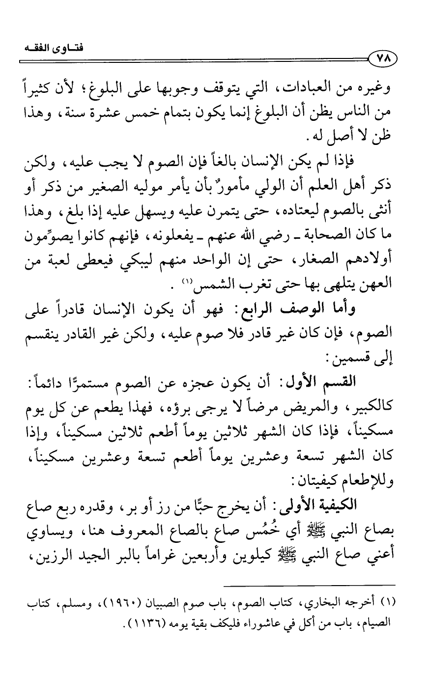 القسم الأول: أن يكون عجزه عن الصوم مستمرًّا دائماً: كالكبير، والمريض مرضاً لا يرجى برؤه، فهذا يطعم عن كل يوم مسكيناً، فإذا كان الشهر ثلاثين يوماً أطعم ثلاثين مسكيناً، وإذا كان الشهر تسعة وعشرين يوماً أطعم تسعة وعشرين مسكيناً، وللإطعام كيفيتان:
