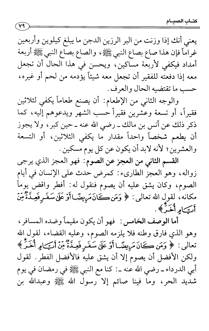 يعني أنك إذا وزنت من البر الرزين الدجن ما يبلغ كيلوين وأربعين غراماً فإن هذا صاع بصاع النبي صَلَّى اللَّهُ عَلَيْهِ وَسَلَّمَ، والصاع بصاع النبي صَلَّى اللَّهُ عَلَيْهِ وَسَلَّمَ أربعة أمداد فيكفي لأربعة مساكين، ويحسن في هذا الحال أن تجعل معه إذا دفعته للفقير أن تجعل معه شيئاً يؤدمه من لحم أو غيره، حسب ما تقتضيه الحال والعرف.