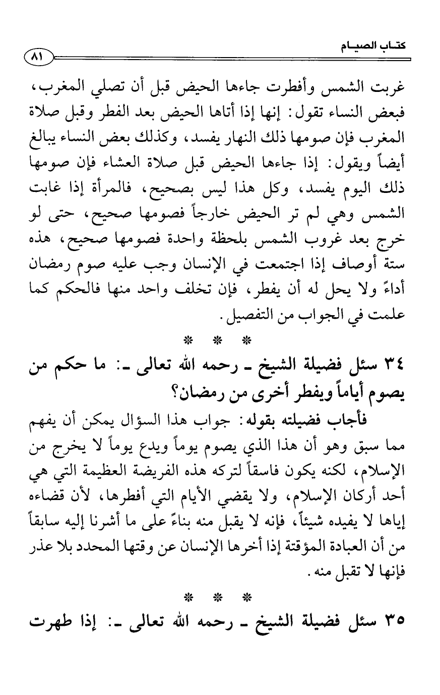 سئل فضيلة الشيخ - رحمه الله تعالى -: ما حكم من يصوم أياماً ويفطر أخرى من رمضان؟