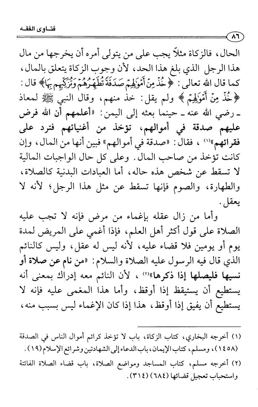 وأما من زال عقله بإغماء من مرض فإنه لا تجب عليه الصلاة على قول أكثر أهل العلم، فإذا أغمي على المريض لمدة يوم أو يومين فلا قضاء عليه، لأنه ليس له عقل، وليس كالنائم الذي قال فيه الرسول عليه الصلاة والسلام: «من نام عن صلاة أو نسيها فليصلها إذا ذكرها» ، لأن النائم معه إدراك بمعنى أنه يستطيع أن يستيقظ إذا أوقظ، وأما هذا المغمى عليه فإنه لا يستطيع أن يفيق إذا أوقظ، هذا إذا كان الإغماء ليس بسبب منه،