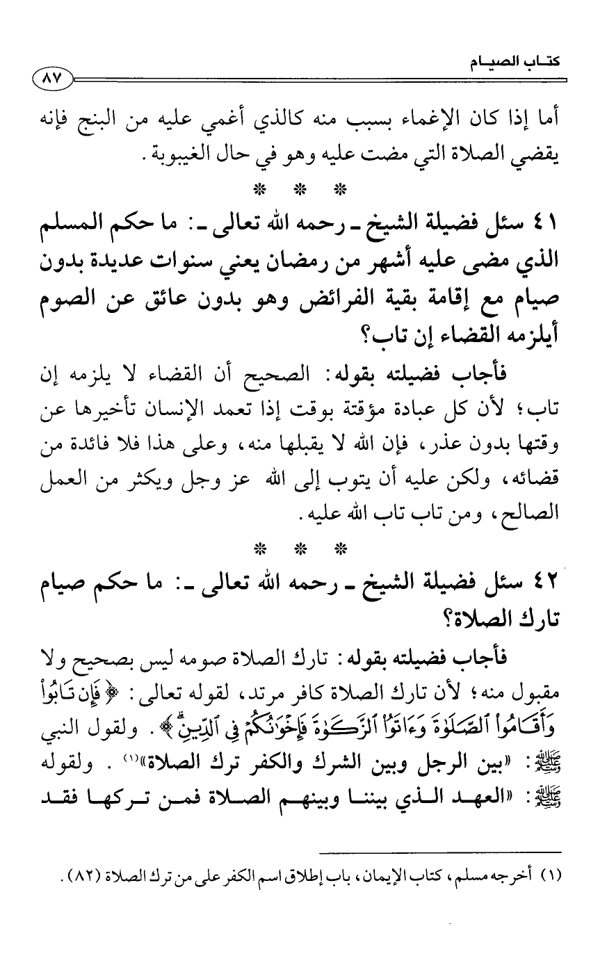 فأجاب فضيلته بقوله: تارك الصلاة صومه ليس بصحيح ولا مقبول منه؛ لأن تارك الصلاة كافر مرتد، لقوله تعالى: {فَإِن تَابُواْ وَأَقَامُواْ الصلاةَ وَءااتَوُاْ الزكاةَ فَإِخْوَانُكُمْ فِي الدِّينِ وَنُفَصِّلُ الأَْيَاتِ لِقَوْمٍ يَعْلَمُونَ} . ولقول النبي صَلَّى اللَّهُ عَلَيْهِ وَسَلَّمَ: «بين الرجل وبين الشرك والكفر ترك الصلاة» . ولقوله صَلَّى اللَّهُ عَلَيْهِ وَسَلَّمَ: «العهد الذي بيننا وبينهم الصلاة فمن تركها فقد