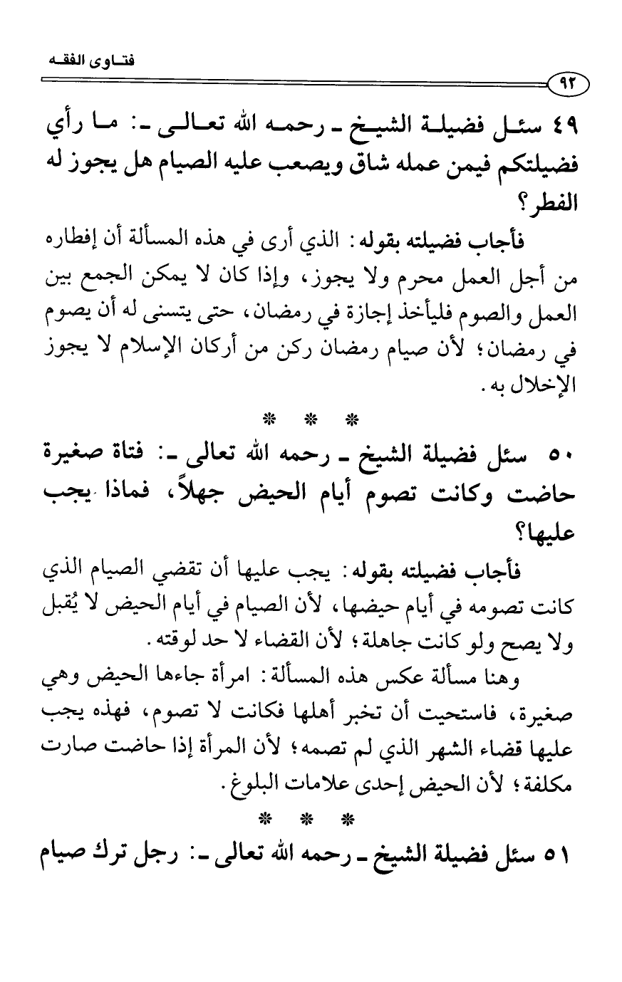 سئل فضيلة الشيخ - رحمه الله تعالى -: ما رأي فضيلتكم فيمن عمله شاق ويصعب عليه الصيام هل يجوز له الفطر؟