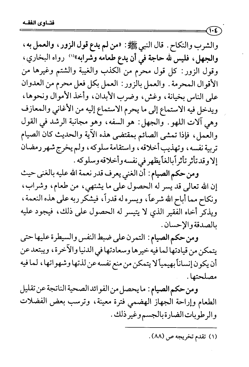 والشرب والنكاح. قال النبي صَلَّى اللَّهُ عَلَيْهِ وَسَلَّمَ: «من لم يدع قول الزور، والعمل به، والجهل، فليس لله حاجة في أن يدع طعامه وشرابه» رواه البخاري، وقول الزور: كل قول محرم من الكذب والغيبة والشتم وغيرها من الأقوال المحرمة. والعمل بالزور: العمل بكل فعل محرم من العدوان على الناس بخيانة، وغش، وضرب الأبدان، وأخذ الأموال ونحوها، ويدخل فيه الاستماع إلى ما يحرم الاستماع إليه من الأغاني والمعازف وهي آلات اللهو. والجهل: هو السفه، وهو مجانبة الرشد في القول والعمل، فإذا تمشى الصائم بمقتضى هذه الآية والحديث كان الصيام تربية نفسه، وتهذيب أخلاقه، واستقامة سلوكه، ولم يخرج شهر رمضان إلا وقد تأثر تأثراً بالغاً يظهر في نفسه وأخلاقه وسلوكه.