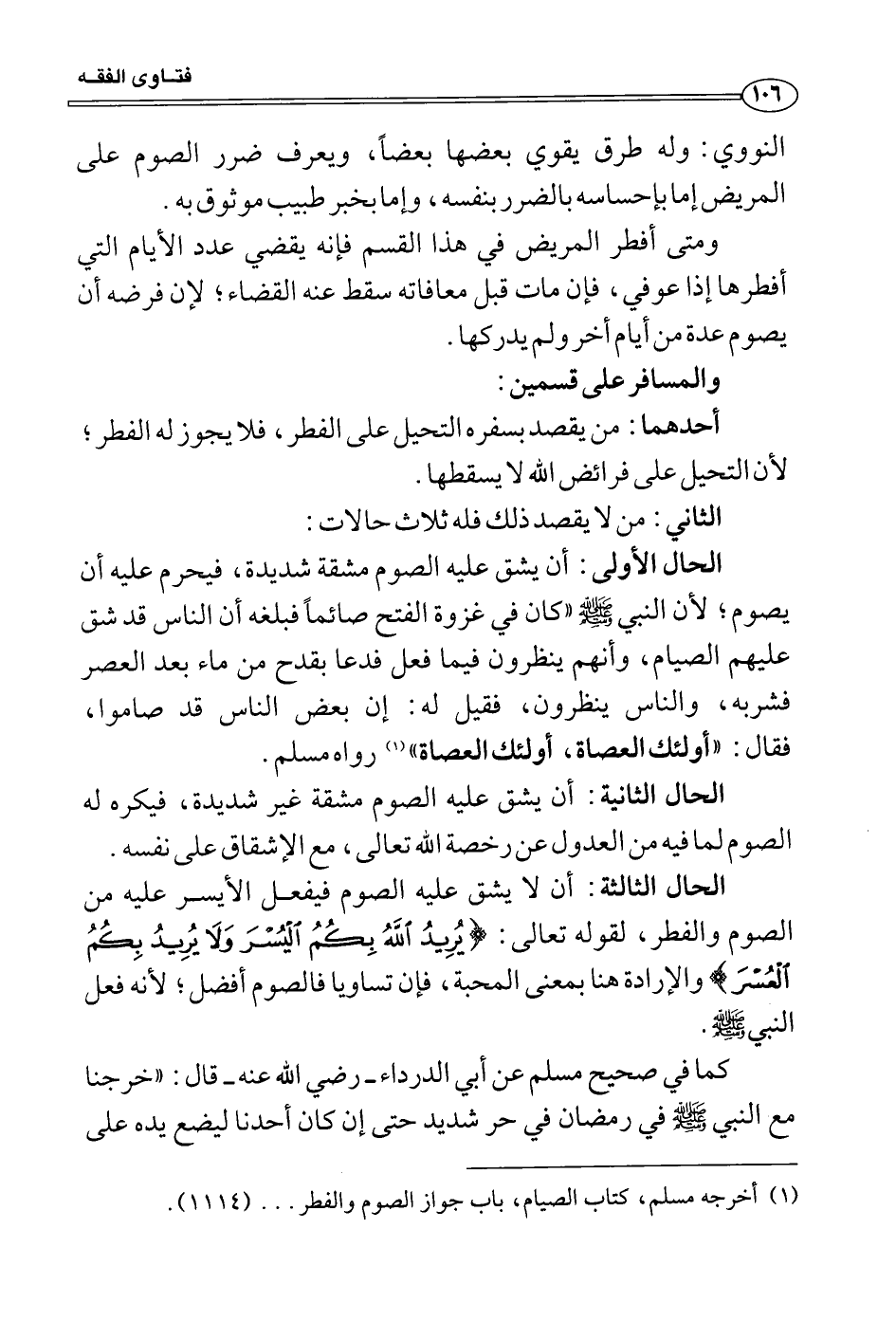 الحال الأولى: أن يشق عليه الصوم مشقة شديدة، فيحرم عليه أن يصوم؛ لأن النبي صَلَّى اللَّهُ عَلَيْهِ وَسَلَّمَ «كان في غزوة الفتح صائماً فبلغه أن الناس قد شق عليهم الصيام، وأنهم ينظرون فيما فعل فدعا بقدح من ماء بعد العصر فشربه، والناس ينظرون، فقيل له: إن بعض الناس قد صاموا، فقال: «أولئك العصاة، أولئك العصاة» رواه مسلم.