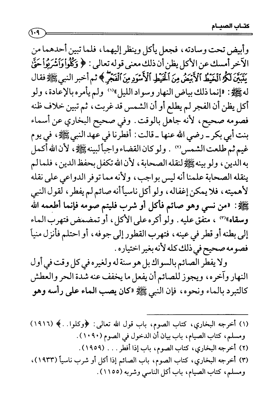 وأبيض تحت وسادته، فجعل يأكل وينظر إليهما، فلما تبين أحدهما من الآخر أمسك عن الأكل يظن أن ذلك معنى قوله تعالى: {وَكُلُواْ وَاشْرَبُواْ حَتَّى يَتَبَيَّنَ لَكُمُ الْخَيْطُ الأَبْيَضُ مِنَ الْخَيْطِ الأَسْوَدِ مِنَ الْفَجْرِ ثُمَّ أَتِمُّواْ الصِّيَامَ إِلَى الَّيْلِ وَلاَ تُبَاشِرُوهُنَّ وَأَنتُمْ عَاكِفُونَ فِي الْمَسَاجِدِ تِلْكَ حُدُودُ اللهِ فَلاَ تَقْرَبُوهَا كَذالِكَ يُبَيِّنُ اللهُ آيَاتِهِ لِلنَّاسِ لَعَلَّهُمْ يَتَّقُونَ الأَسْوَدِ مِنَ الْفَجْرِ ثُمَّ أَتِمُّواْ الصِّيَامَ إِلَى الَّيْلِ وَلاَ تُبَاشِرُوهُنَّ وَأَنتُمْ عَاكِفُونَ فِي الْمَسَاجِدِ تِلْكَ حُدُودُ اللهِ فَلاَ تَقْرَبُوهَا كَذالِكَ يُبَيِّنُ اللهُ آيَاتِهِ لِلنَّاسِ لَعَلَّهُمْ يَتَّقُونَ} ثم أخبر النبي صَلَّى اللَّهُ عَلَيْهِ وَسَلَّمَ فقال له صَلَّى اللَّهُ عَلَيْهِ وَسَلَّمَ: «إنما ذلك بياض النهار وسواد الليل» ولم يأمره بالإعادة، ولو أكل يظن أن الفجر لم يطلع أو أن الشمس قد غربت، ثم تبين خلاف ظنه فصومه صحيح، لأنه جاهل بالوقت. وفي صحيح البخاري عن أسماء بنت أبي بكر رضي الله عنها