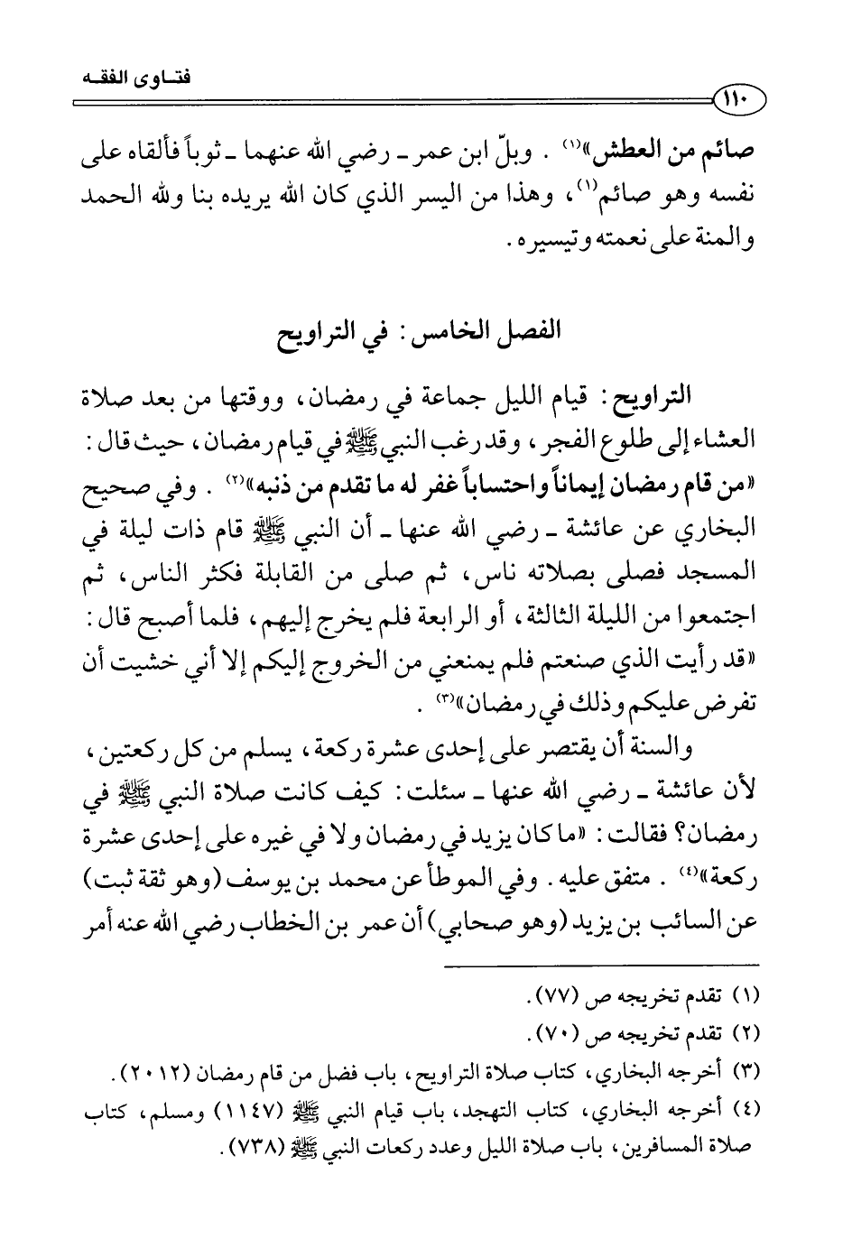 والسنة أن يقتصر على إحدى عشرة ركعة، يسلم من كل ركعتين، لأن عائشة رضي الله عنها سئلت: كيف كانت صلاة النبي صَلَّى اللَّهُ عَلَيْهِ وَسَلَّمَ في رمضان؟ فقالت: «ما كان يزيد في رمضان ولا في غيره على إحدى عشرة ركعة» . متفق عليه. وفي الموطأ عن محمد بن يوسف (وهو ثقة ثبت) عن السائب بن يزيد (وهو صحابي) أن عمر بن الخطاب رضي الله عنه أمر