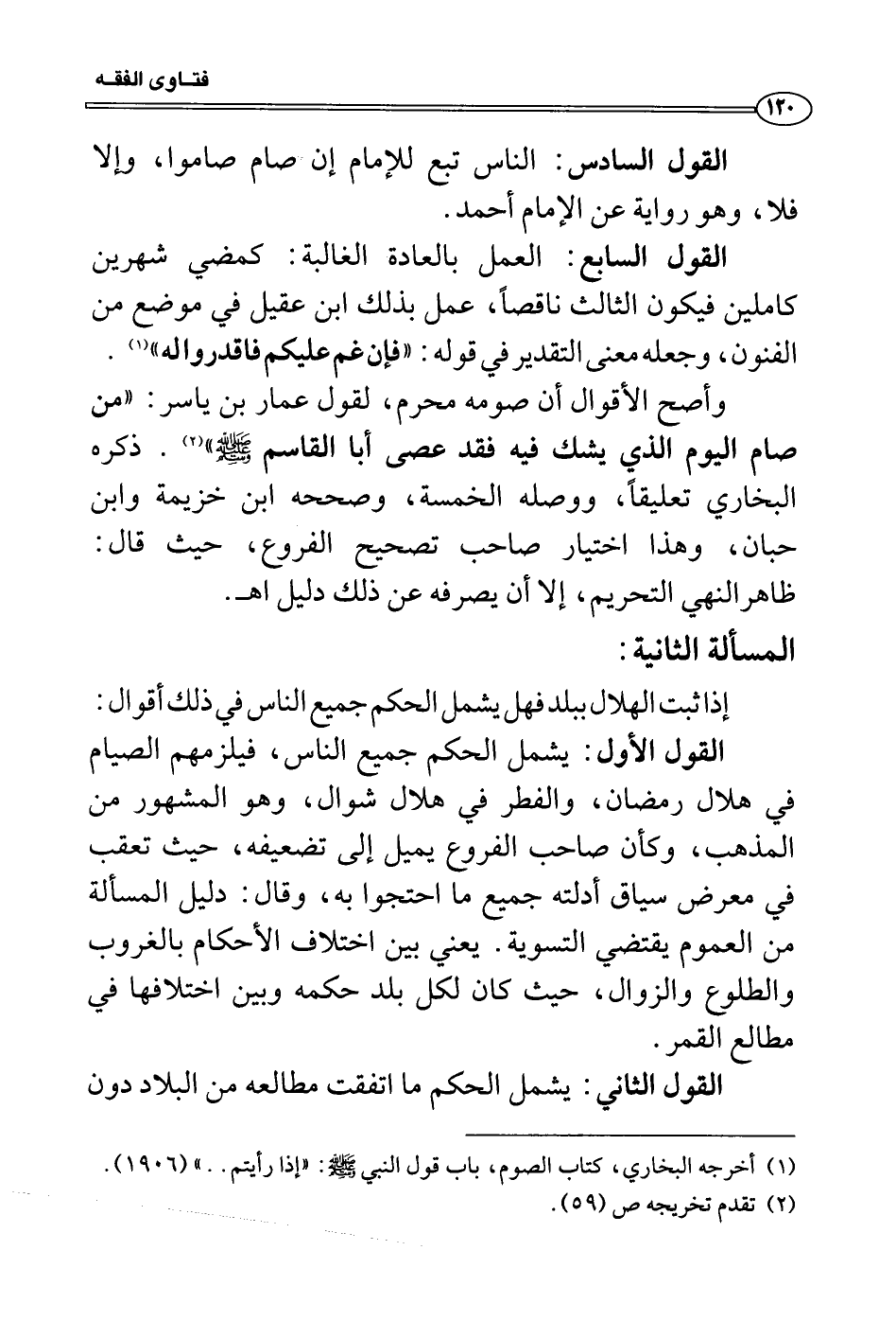 القول الأول: يشمل الحكم جميع الناس، فيلزمهم الصيام في هلال رمضان، والفطر في هلال شوال، وهو المشهور من المذهب، وكأن صاحب الفروع يميل إلى تضعيفه، حيث تعقب في معرض سياق أدلته جميع ما احتجوا به، وقال: دليل المسألة من العموم يقتضي التسوية. يعني بين اختلاف الأحكام بالغروب والطلوع والزوال، حيث كان لكل بلد حكمه وبين اختلافها في مطالع القمر.