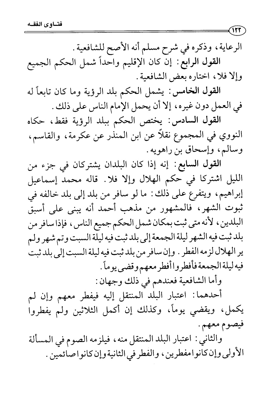 القول السابع: إنه إذا كان البلدان يشتركان في جزء من الليل اشتركا في حكم الهلال وإلا فلا. قاله محمد إسماعيل إبراهيم، ويتفرع على ذلك: ما لو سافر من بلد إلى بلد خالفه في ثبوت الشهر، فالمشهور من مذهب أحمد أنه يبنى على أسبق البلدين، لأنه متى ثبت بمكان شمل الحكم جميع الناس، فإذا سافر من بلد ثبت فيه الشهر ليلة الجمعة إلى بلد ثبت فيه ليلة السبت وتم شهر ولم ير الهلال لزمه الفطر. وإن سافر من بلد ثبت فيه ليلة السبت إلى بلد ثبت فيه ليلة الجمعة فأفطروا أفطر معهم وقضى يوماً.
