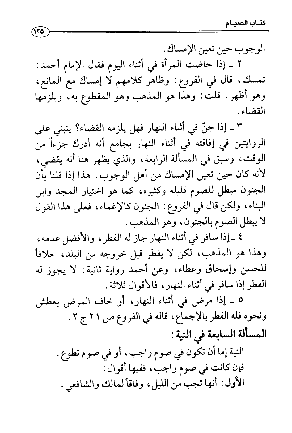 3 إذا جنّ في أثناء النهار فهل يلزمه القضاء؟ ينبني على الروايتين في إفاقته في أثناء النهار بجامع أنه أدرك جزءاً من الوقت، وسبق في المسألة الرابعة، والذي يظهر هنا أنه يقضي، لأنه كان حين تعين الإمساك من أهل الوجوب. هذا إذا قلنا بأن الجنون مبطل للصوم قليله وكثيره، كما هو اختيار المجد وابن البناء، ولكن قال في الفروع: الجنون كالإغماء، فعلى هذا القول لا يبطل الصوم بالجنون، وهو المذهب.