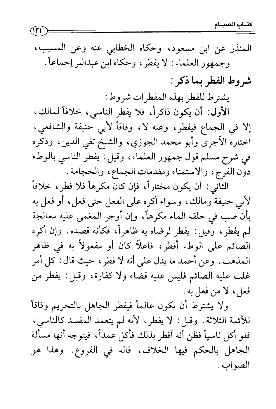 الأول: أن يكون ذاكراً، فلا يفطر الناسي، خلافاً لمالك، إلا في الجماع فيفطر، وعنه لا، وفاقاً لأبي حنيفة والشافعي، اختاره الا"جرى وأبو محمد الجوزي، والشيخ تقي الدين، وذكره في شرح مسلم قول جمهور العلماء، وقيل: يفطر الناسي بالوطء دون الفرج، والاستمناء ومقدمات الجماع، والحجامة.