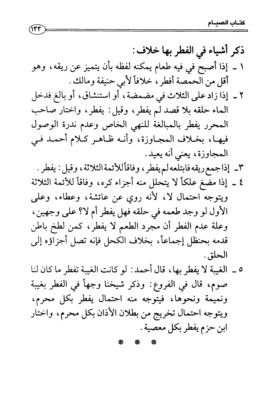 5 الغيبة لا يفطر بها، قال أحمد: لو كانت الغيبة تفطر ما كان لنا صوم، قال في الفروع: وذكر شيخنا وجهاً في الفطر بغيبة ونميمة ونحوها، فيتوجه منه احتمال يفطر بكل محرم، ويتوجه احتمال تخريج من بطلان الأذان بكل محرم، واختار ابن حزم يفطر بكل معصية.